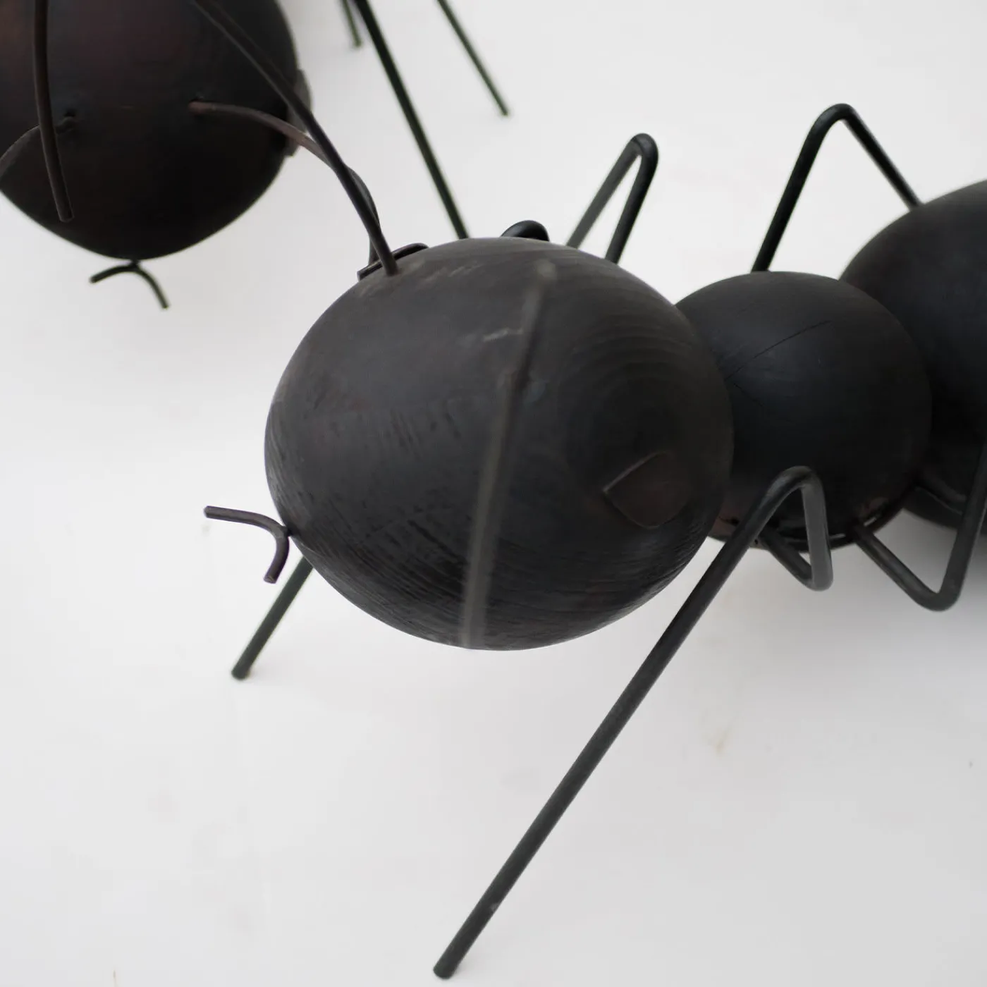 Questo giocoso set composto da due sculture a forma di formica – “formica” è l’italiano per formica – è un’ode al valore sottovalutato e all’altruismo naturale di questi piccoli animali, qui rappresentati con impareggiabile maestria. Sia la formica più grande (cm 75x45x41 H) che quella più piccola (cm 62x42x27 H) hanno corpi costituiti da sfere di legno con superficie bruciata a fuoco e da antenne, bocche, occhi e zampe realizzati artigianalmente in ferro brunito, piegato a fuoco e poi protetto con olio.