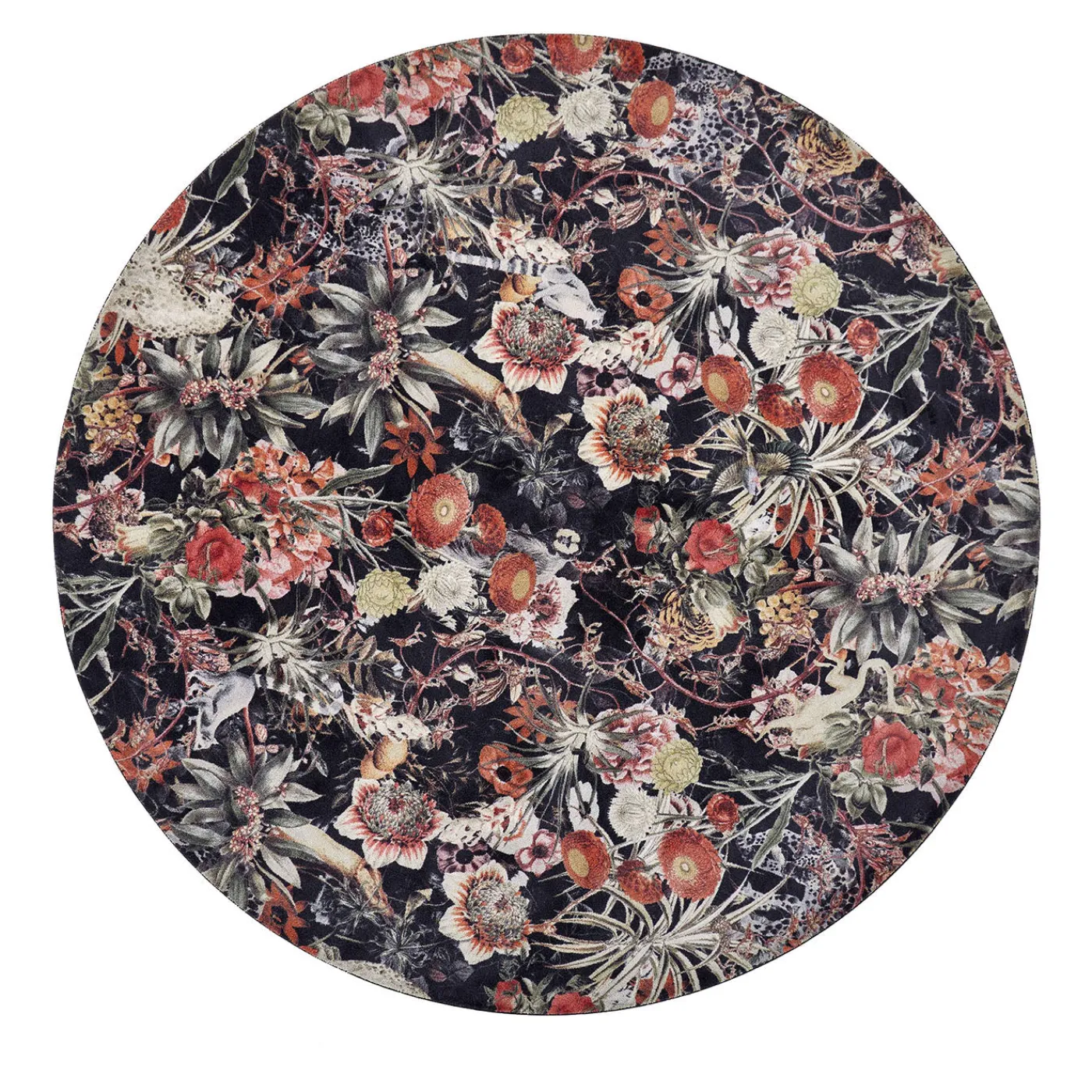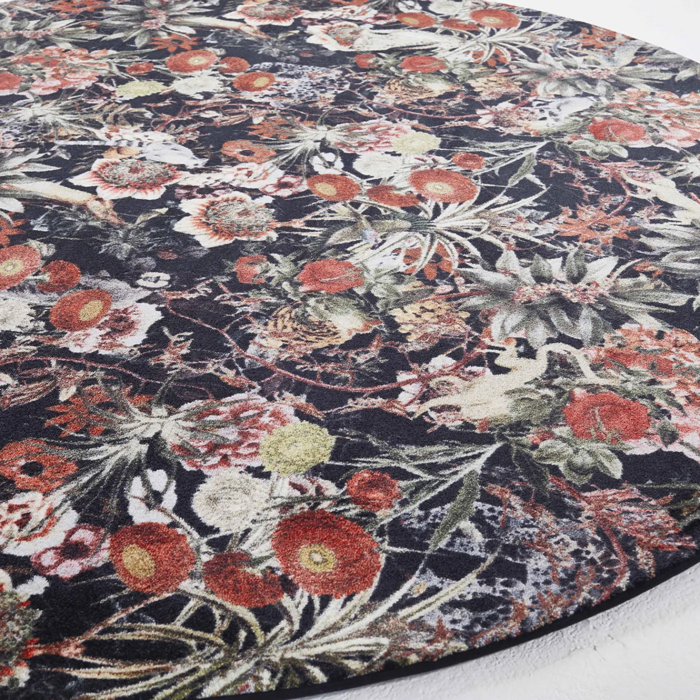 Il tappeto Zaira presenta una stampa intricata che raffigura vivaci fiori esotici e fauna selvatica su uno sfondo profondo e scuro. Il design ricco e dettagliato accentua la profondità visiva e il senso di movimento, rendendolo un elemento centrale di grande impatto in qualsiasi ambiente. Ideale per chi desidera infondere un tocco di avventura e un’eleganza unica nei propri interni, questo tappeto rotondo di medie dimensioni unisce un’arte audace a uno stile raffinato.