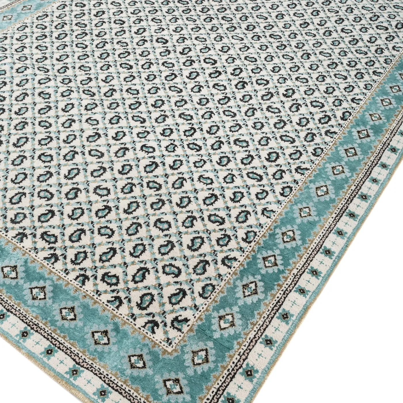 Scoprite la squisita maestria del tappeto Marcellino annodato a mano, dove il fascino vintage incontra l’eleganza contemporanea. Ispirato agli audaci disegni della decoratrice francese Madeleine Castaing, questo lussuoso tappeto mostra il suo stile caratteristico attraverso intricati motivi paisley stilizzati inseriti in un traliccio decorativo. Un classico bordo geometrico ornamentale incornicia elegantemente il disegno, esaltandone il fascino visivo. Realizzato in una sontuosa miscela di lana e seta di bambù, questo tappeto presenta un aspetto vintage e invecchiato nei toni del bianco e del blu piscina. I motivi audaci e i colori ricchi evocano un senso di raffinatezza, rendendolo un pezzo forte adatto a diversi stili di interni. Meticolosamente annodato a mano nell’India rurale, è una testimonianza della moderna maestria artigianale, che si affianca alla visione artistica di uno dei più grandi pionieri del design francese.