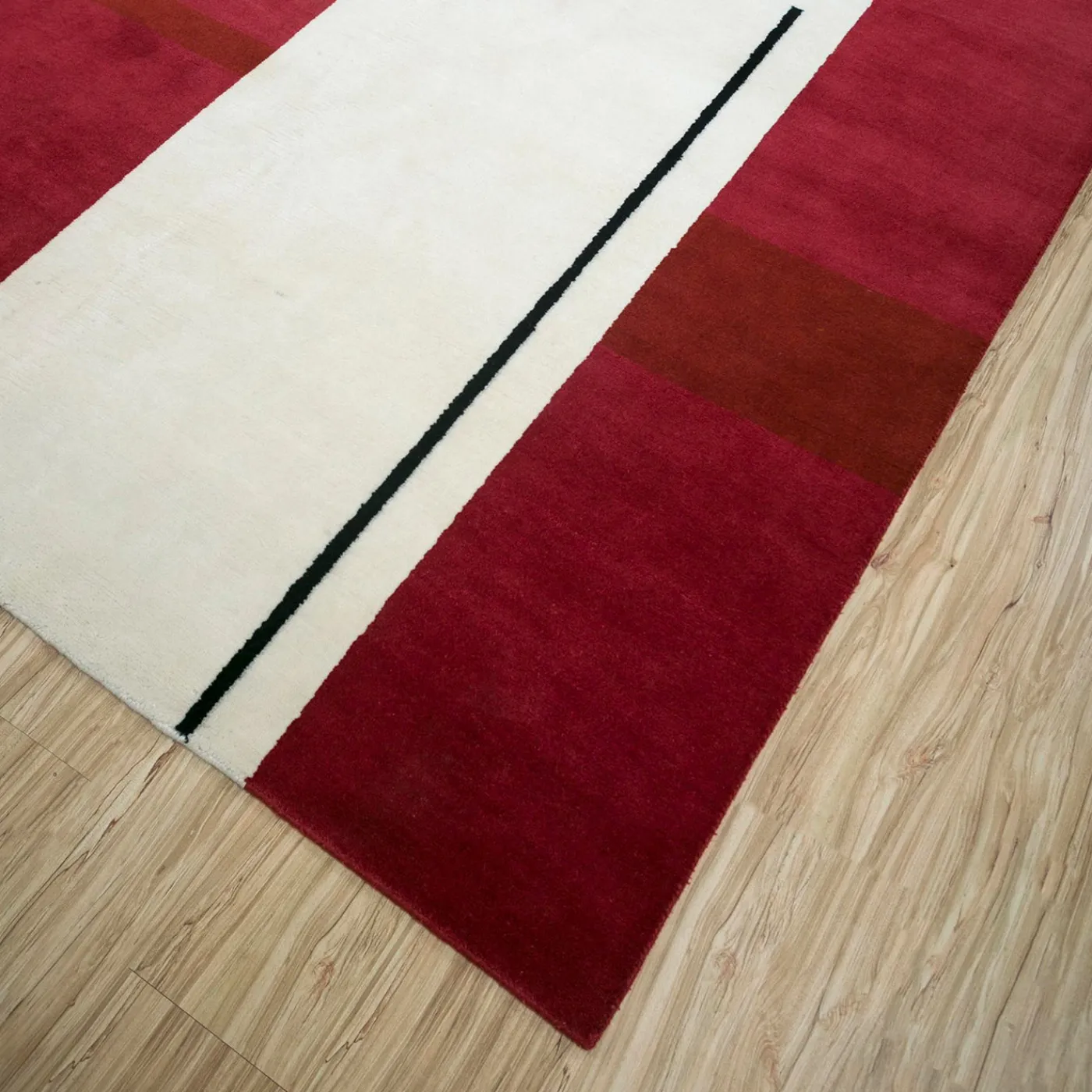 Audace e raffinatezza caratterizzano il tappeto rettangolare rosso in lana sthir, che presenta un design straordinario nei toni di cinabro e papiro, accentuato da una sottile linea nera. La sua lavorazione a mano con 80 nodi offre dettagli meticolosi e una ricca texture che migliora il calore. Ideale per interni rustici o eclettici, questo pezzo porta profondità e un’estetica tribale moderna in ampie aree living open-plan. Realizzato con precisione in India, esemplifica l’arte abilmente realizzata e un fascino senza tempo.