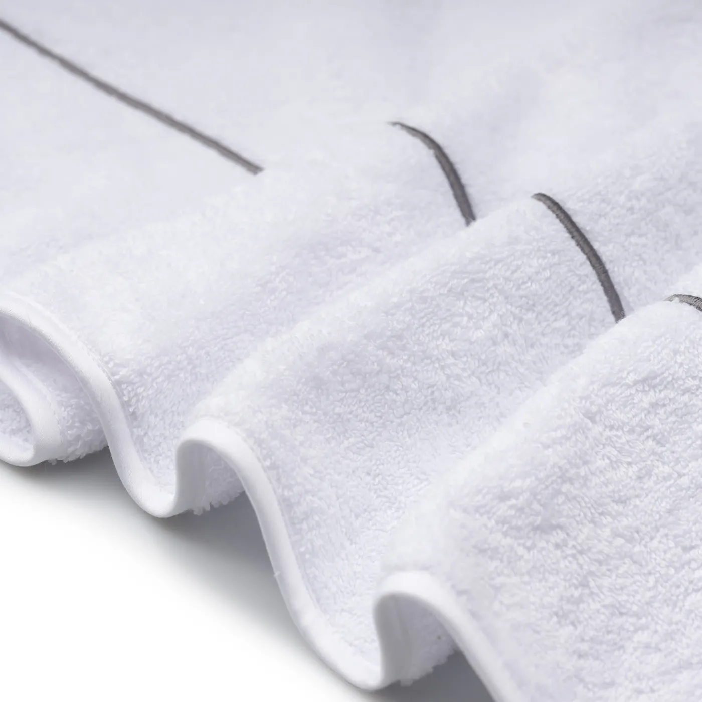 Splendida incarnazione del savoir-faire italiano, questo set di tre asciugamani presenta un design semplice ma raffinato, impreziosito da linee geometriche pulite in un colore tortora a contrasto. Composto da un asciugamano per gli ospiti (40×60 cm), un asciugamano per le mani (60×100 cm) e un asciugamano da bagno (110×100 cm), ogni pezzo è abilmente realizzato a mano in spugna bianca di prima qualità.