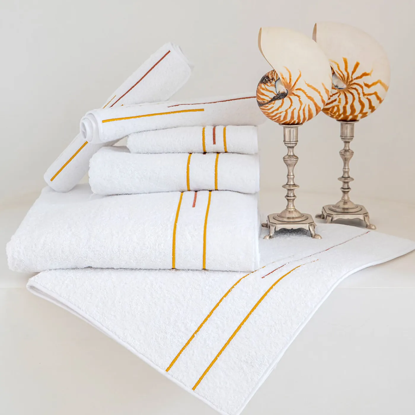 Il set di asciugamani Namasté comprende un asciugamano da bagno (110 x 150 cm), un asciugamano per le mani (60 x 100 cm) e un asciugamano per ospiti (40 x 60 cm) realizzati in spessa spugna di cotone bianco da 550 gsm. Ogni pezzo presenta una finitura a sbieco e un raffinato ricamo sul lato corto, combinando eleganza con praticità, rendendole perfette per l’uso quotidiano.