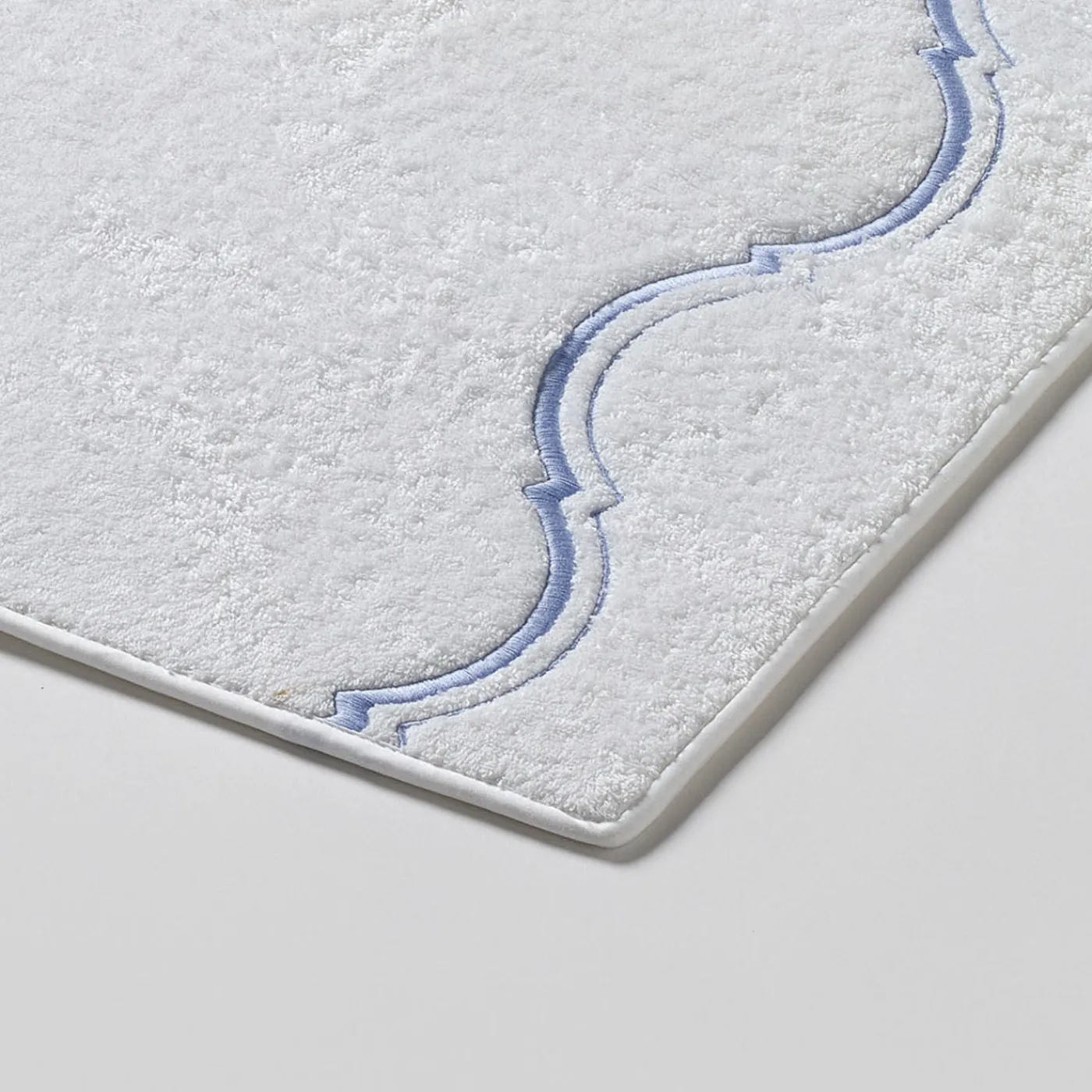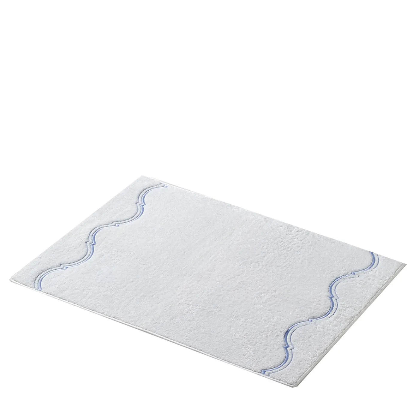 Un tappetino da bagno bianco con finitura a taglio obliquo e ricami intricati su due lati corti, che offre un sottile tocco decorativo che arricchisce un ambiente bagno sereno. Il design bilancia la semplicità con dettagli raffinati, rendendolo un’aggiunta versatile agli interni contemporanei e classici.