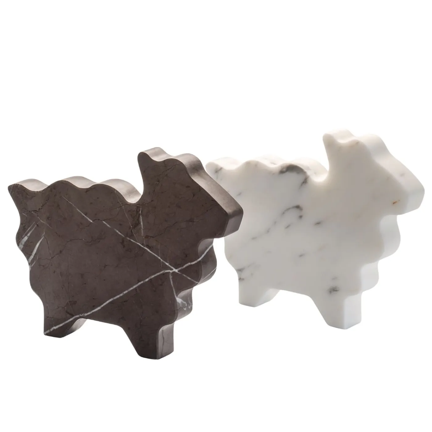 Una grande pecora stilizzata in marmo grigio Grafite, questo disegno di Alessandra Grasso appartiene alla serie Factory di statuette a forma di animale che diventano giocosi fermacarte. Sapientemente lavorata a mano, può essere esposta su una consolle o su un tavolo d’appoggio per distillare il suo ironico fascino bucolico, mantenendo un’eleganza disinvolta che deriva dall’uso di una pietra naturale pregiata. Sono disponibili anche varianti più piccole e un’opzione in marmo bianco di Carrara.