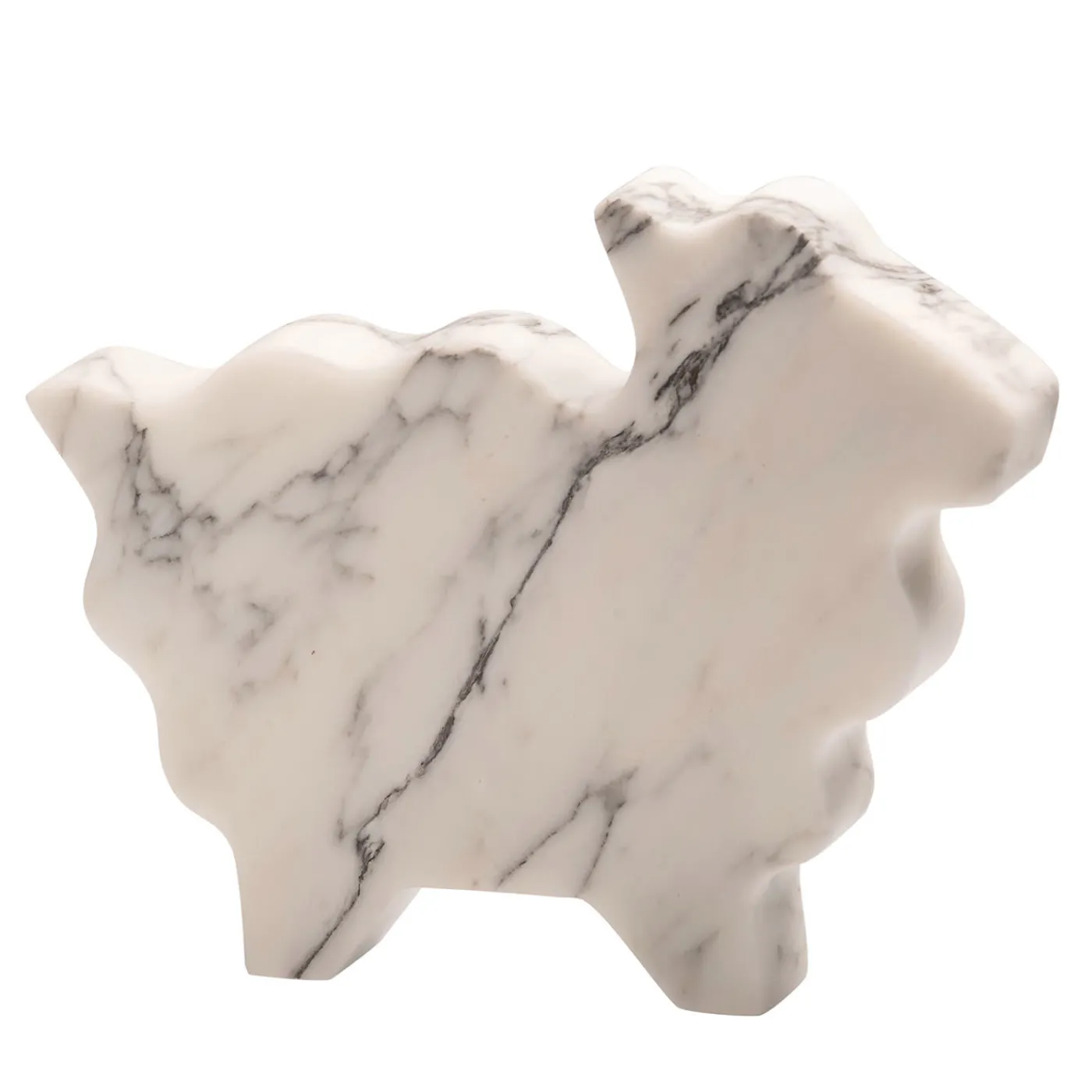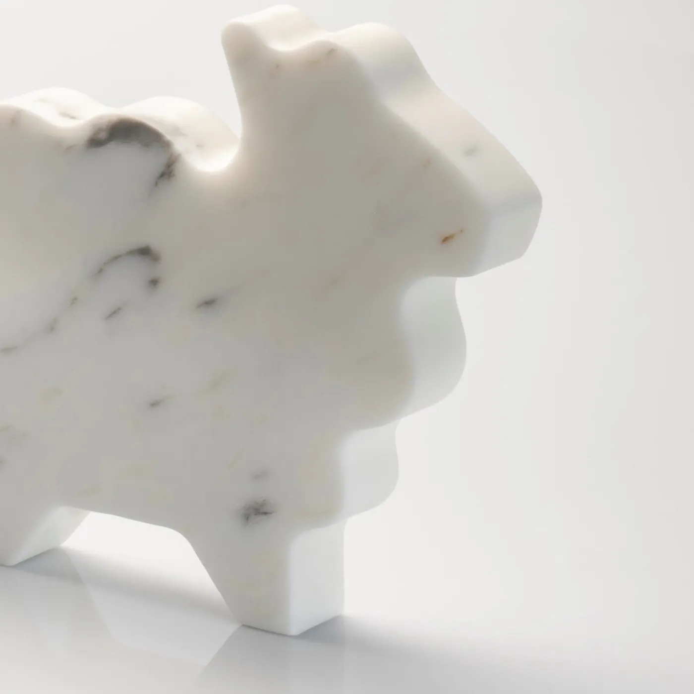Una pecorella innocente per tenere a posto le lenzuola sciolte con un pizzico di estrosità. Questo originale fermacarte o semplice scultura in marmo bianco di Carrara, sapientemente lavorato a mano, appartiene alla serie Factory di singolari disegni a forma di animali da fattoria di Alessandra Grasso. Disponibile anche in due varianti più piccole e in una variante in marmo grigio Grafite, presenta un elegante profilo stilizzato che fa risaltare le venature naturali della pietra.