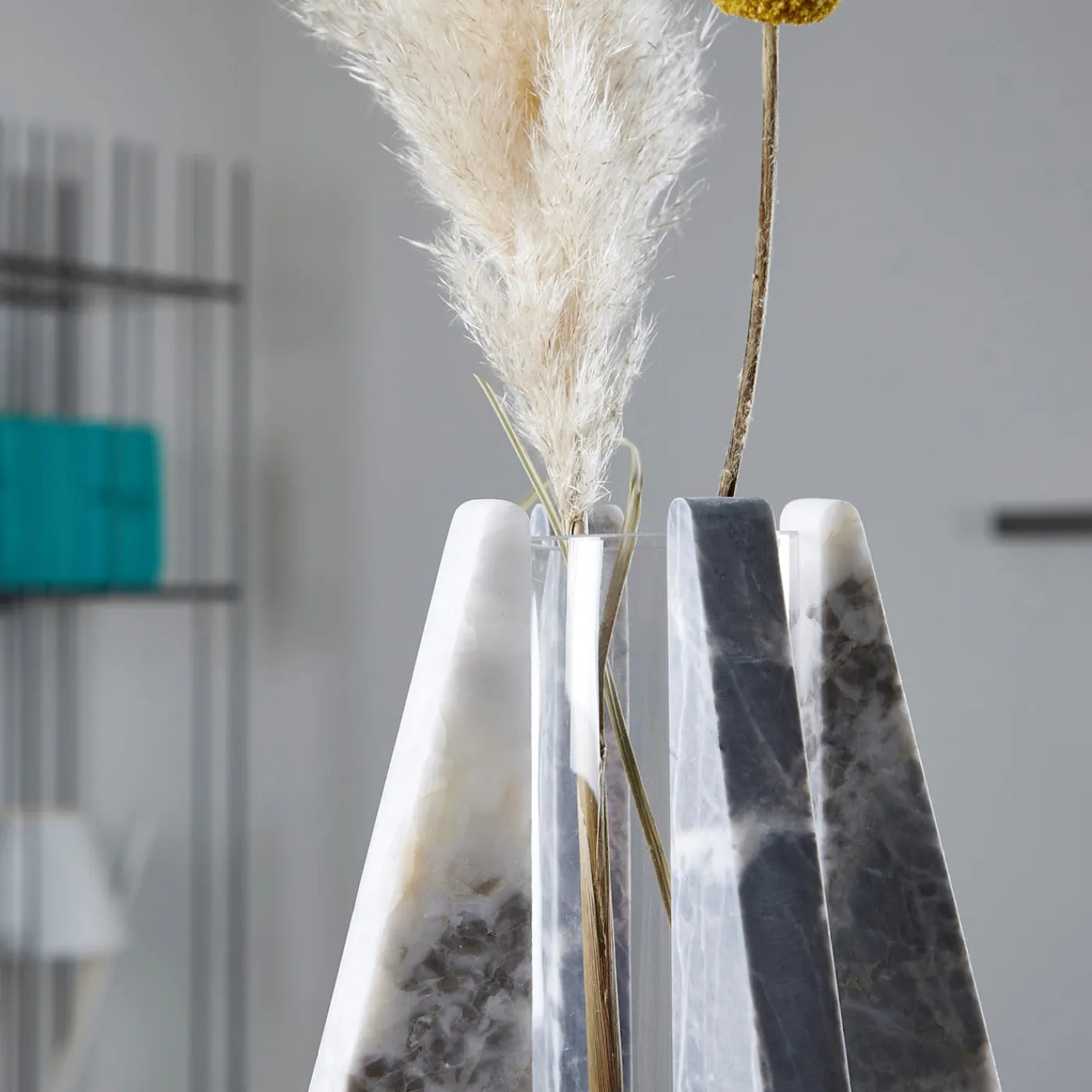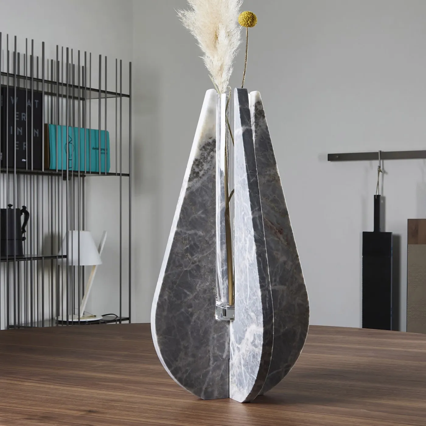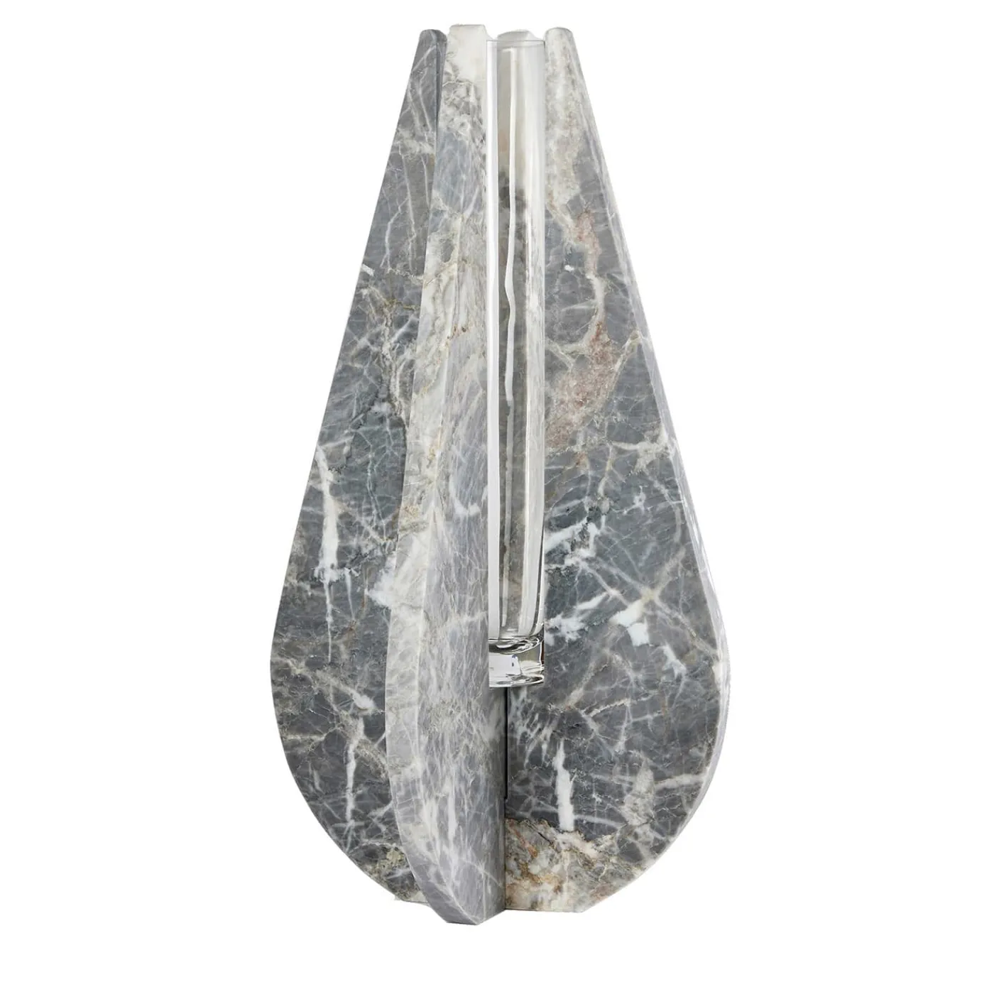 Ricco di fascino scultoreo, questo vaso di Alessandra Grasso sintetizza magistralmente i concetti opposti di leggerezza e robustezza grazie alla sapiente combinazione del marmo Fior di Pesco con una forma armoniosa che ricorda una goccia d’acqua. Venature intricate e imprevedibili ornano gli elementi marmorei a incastro che ospitano il cilindro di vetro, perfetto per accogliere i fiori.