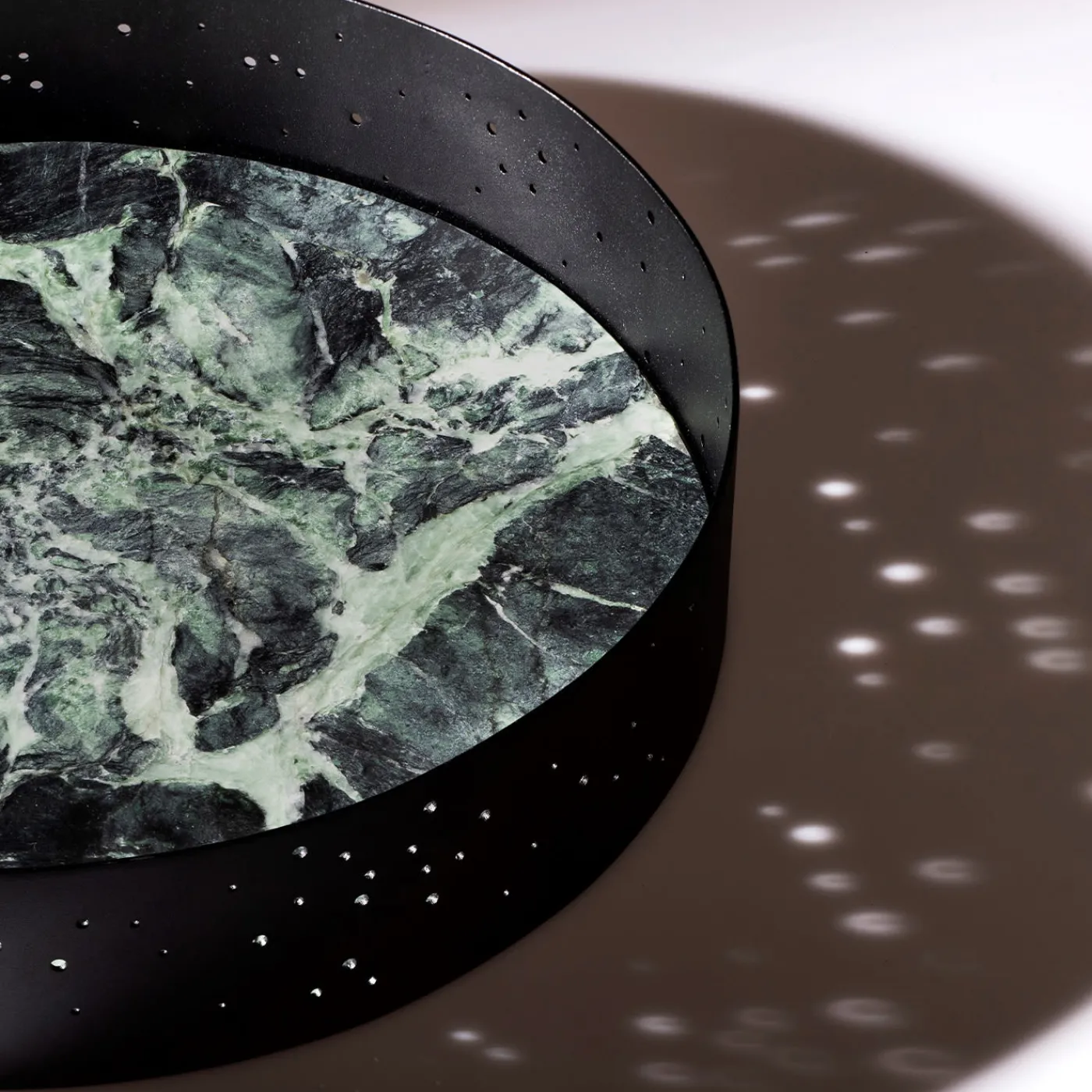 Splendido come vassoio o centrotavola, questo design esclusivo si ispira all’eclittica, il piano dell’orbita terrestre intorno al Sole. Il motivo dei fori distribuiti in modo casuale che abbelliscono la struttura metallica simboleggia la miriade di stelle della Via Lattea. Il fondo interno in marmo Verde Alpi conferisce un’estetica unica e una sensazione di lusso al pezzo, disponibile anche in diverse varianti di marmo su richiesta al Concierge.