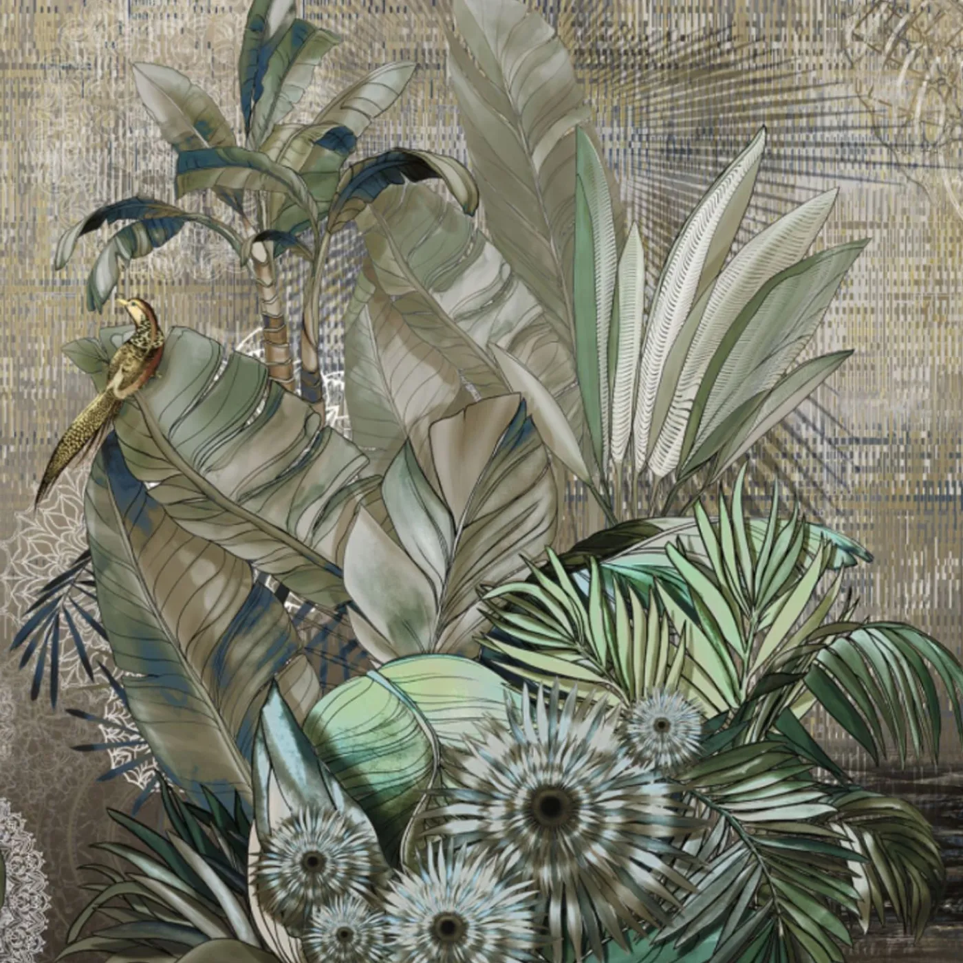 KOHRO Tessuto da rivestimento in poliestere Sarasvati verde e bronzo> Carte Da Parati