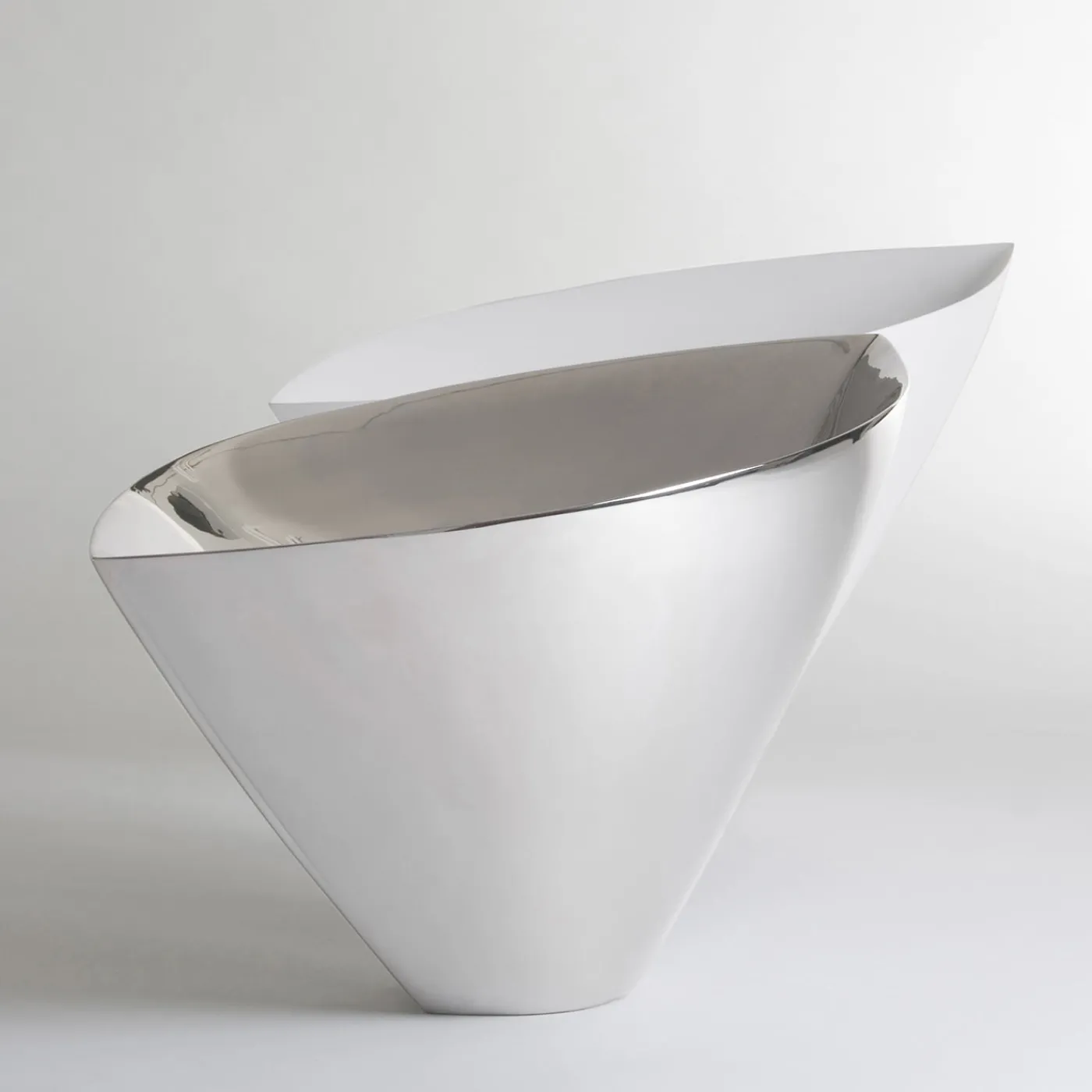 La ciotola Aurica Platinum presenta un design elegante e asimmetrico che funge da centro tavola stiloso per qualsiasi interno moderno. La sua superficie liscia e riflettente aggiunge un tocco di sofisticatezza e crea un impatto visivo dinamico. Questo centro tavola decorativo di dimensioni medie bilancia forma e funzione, rendendolo adatto per esporre composizioni floreali o come elemento scultoreo autonomo negli spazi abitativi.