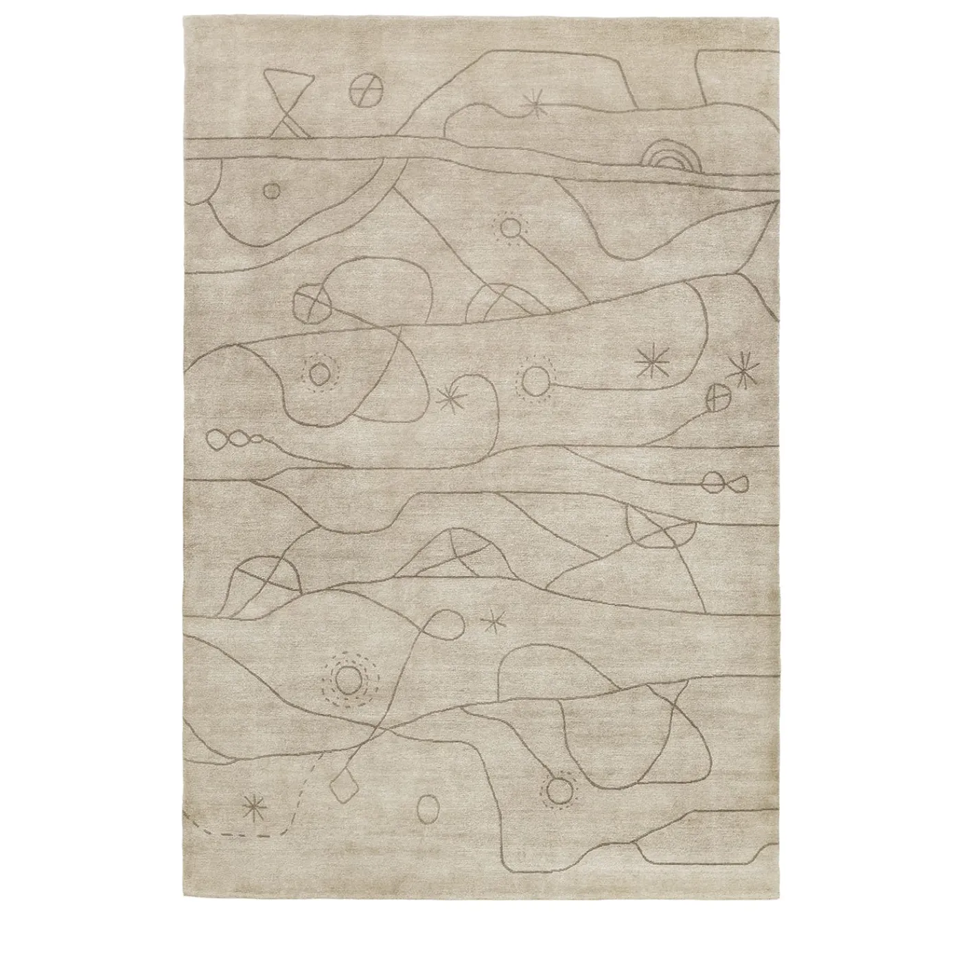 Annodato a mano in Nepal con una densità di 100 nodi, questo magnifico prodotto infonderà eleganza e fascino a qualsiasi arredamento moderno. Questo tappeto beige chiaro, con motivo grigio, è realizzato in lana filata a mano, lino naturale e seta di bambù e presenta un disegno naif di un paesaggio senza tempo.