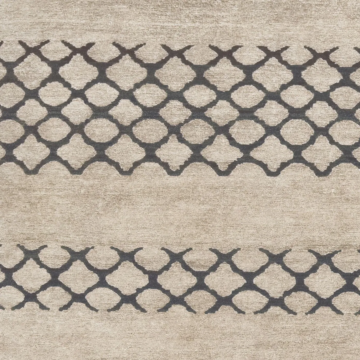 Questo magnifico tappeto è stato annodato a mano in Nepal utilizzando il 55% di lino naturale e il 45% di lana. I suoi 100 nodi compongono un pezzo in cui il beige chiaro dello sfondo crea strisce uniformi che interrompono le decorazioni grigio scuro che corrono orizzontalmente in file di elementi ovali collegati. Le misure standard sono 170×240, 200×250, 200×300, 220×300, 250×300, 250×350, 300×400, 350×420, 350 x500, 400×600 cm per il tappeto rettangolare e 250×250, 300×300, 400×400 cm per quello quadrato. È possibile ordinare misure, colori e materiali personalizzati (chiedere i prezzi al concierge).