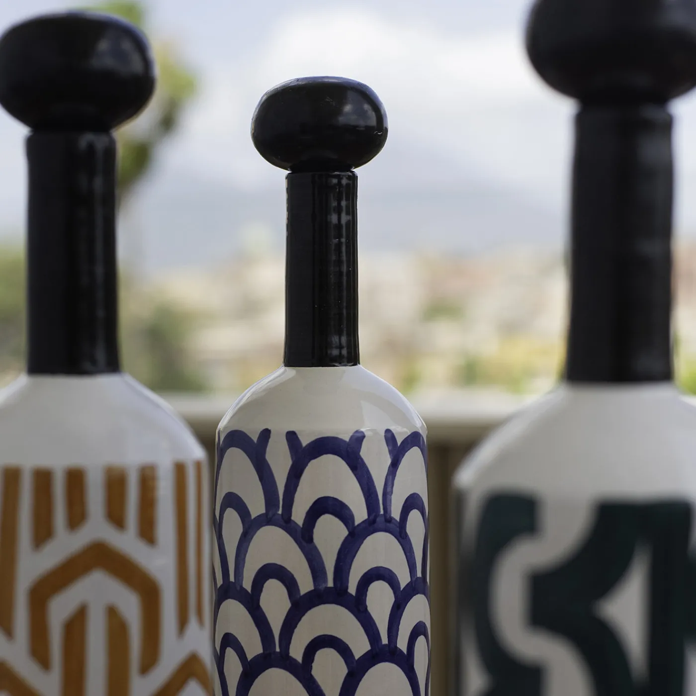 Questa bottiglia decorativa presenta un design distintivo ispirato allo stile Bauhaus, caratterizzato da audaci motivi semicircolari blu su uno sfondo bianco in contrasto. Interamente decorata a mano, presenta lievi imperfezioni uniche e piccoli segni che ne esaltano il carattere nel tempo. Il collo allungato e il tappo arrotondato aggiungono un tocco elegante, rendendola un pezzo decorativo sorprendente per interni contemporanei.