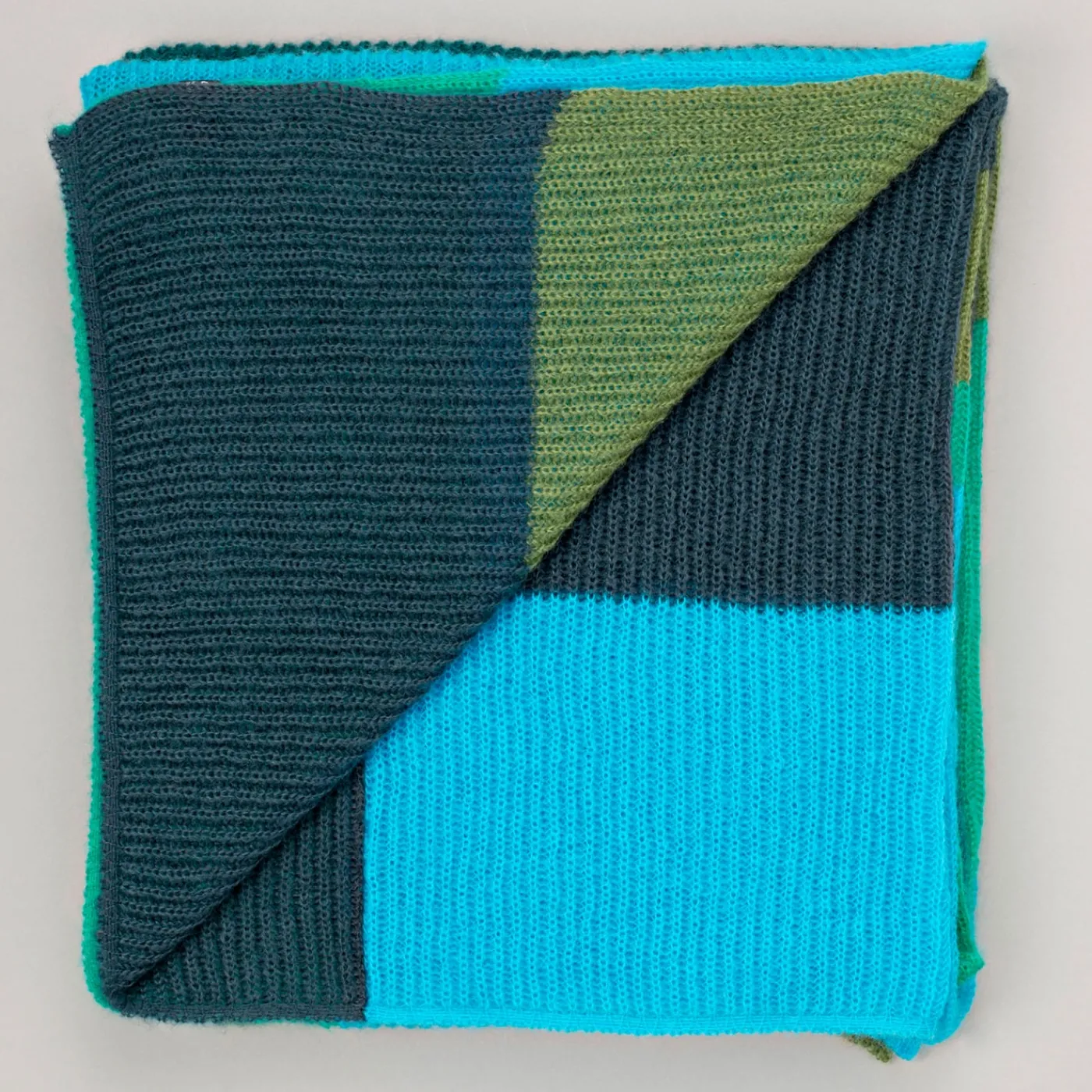 Questa coperta glamour dai toni vivaci del blu e del verde darà calore e colore a un divano o a una poltrona monocromatici e, una volta srotolata, rivelerà il suo splendido motivo asimmetrico, simile a un pixel. La sua trama all’inglese è stata ottenuta utilizzando telai meccanici degli anni ’30 e cucendo insieme tre capi a mano. Ogni pezzo di stoffa sfoggia un motivo particolare che combina cinque colori disposti in nove aree di dimensioni diverse.
