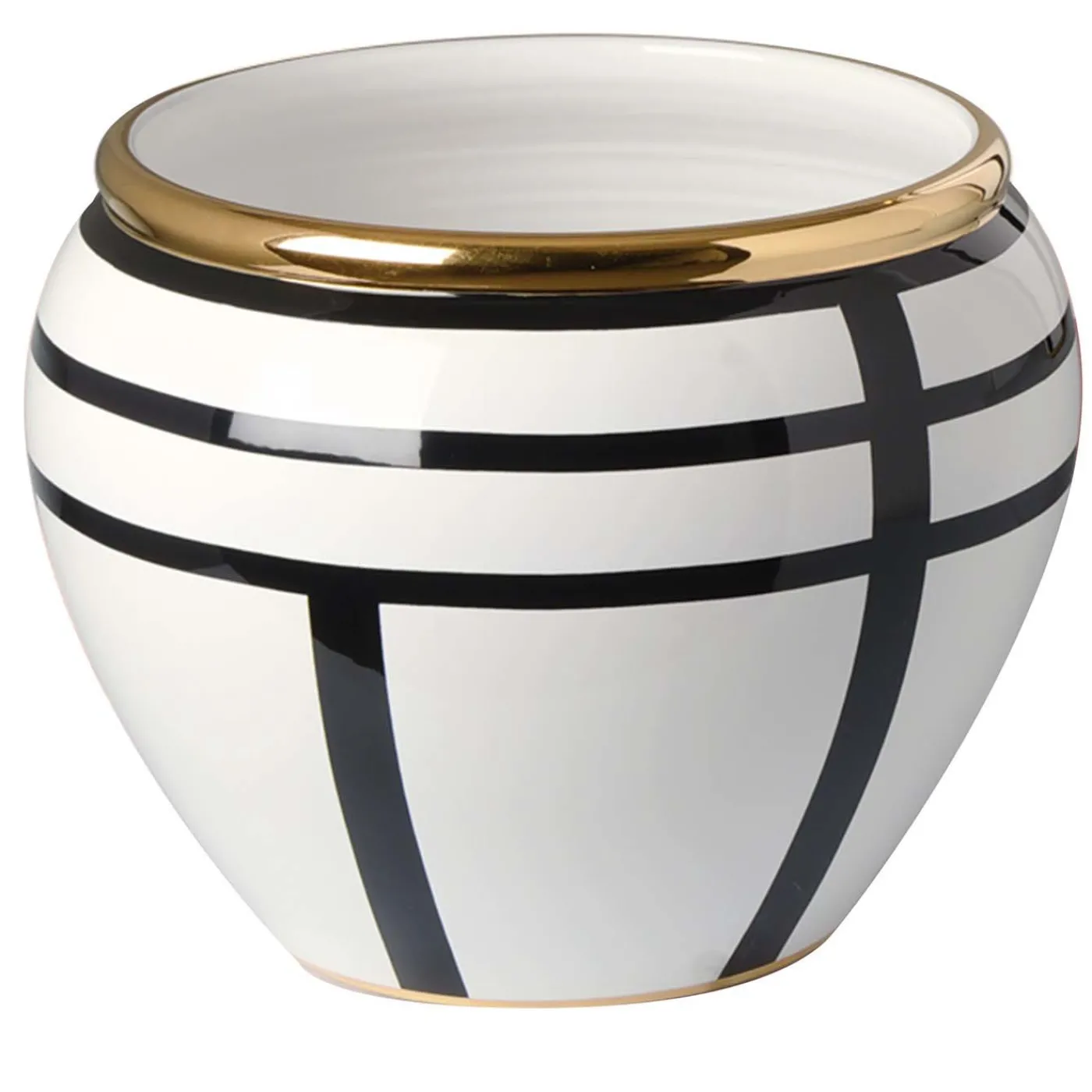 Questo cachepot di ispirazione anni Sessanta trasmette un carattere forte e glamour dalle strisce nere perpendicolari che ornano la sua silhouette rigonfia di porcellana bianca. La scelta del bianco e nero conferisce a questo pezzo un’allure senza tempo, arricchita dalla lucida sfumatura dorata del bordo.