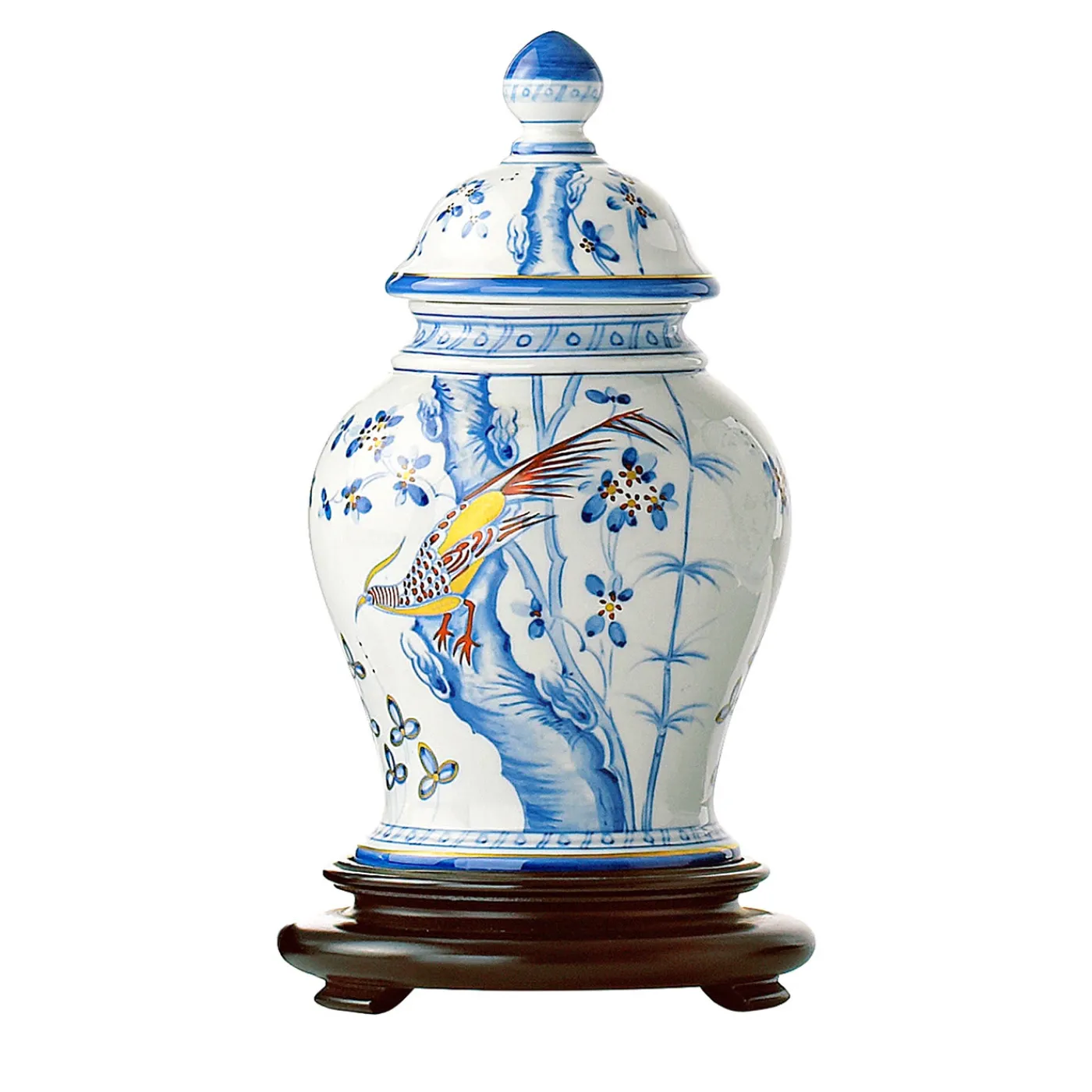 Con un design ornato e delicato, questa potiche in porcellana fa parte di una collezione che prende il nome dai graziosi e colorati fagiani che decorano ogni pezzo. La sua silhouette sinuosa ritrae un paesaggio forestale dipinto di blu e comprende un coperchio a cupola ravvivato da un terminale sferico.