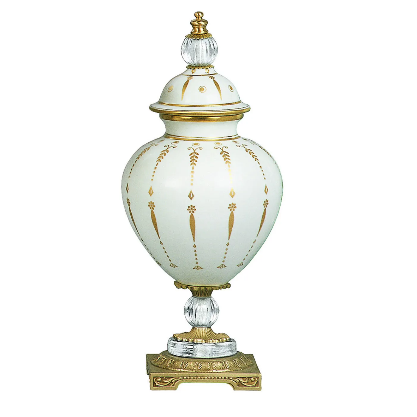 Questa opulenta potiche in porcellana bianca vanta decorazioni in oro su tutta la sua silhouette rigonfia, compresi gli accenti che sottolineano i bordi. Poggiata su una base quadrata in metallo con piedi rifiniti in oro spazzolato, presenta inserti abbinati a freschi elementi decorativi in vetro che completano la base e il coperchio a cupola. Ideale da esporre su credenze classiche e lussuose o su consolle da ingresso.