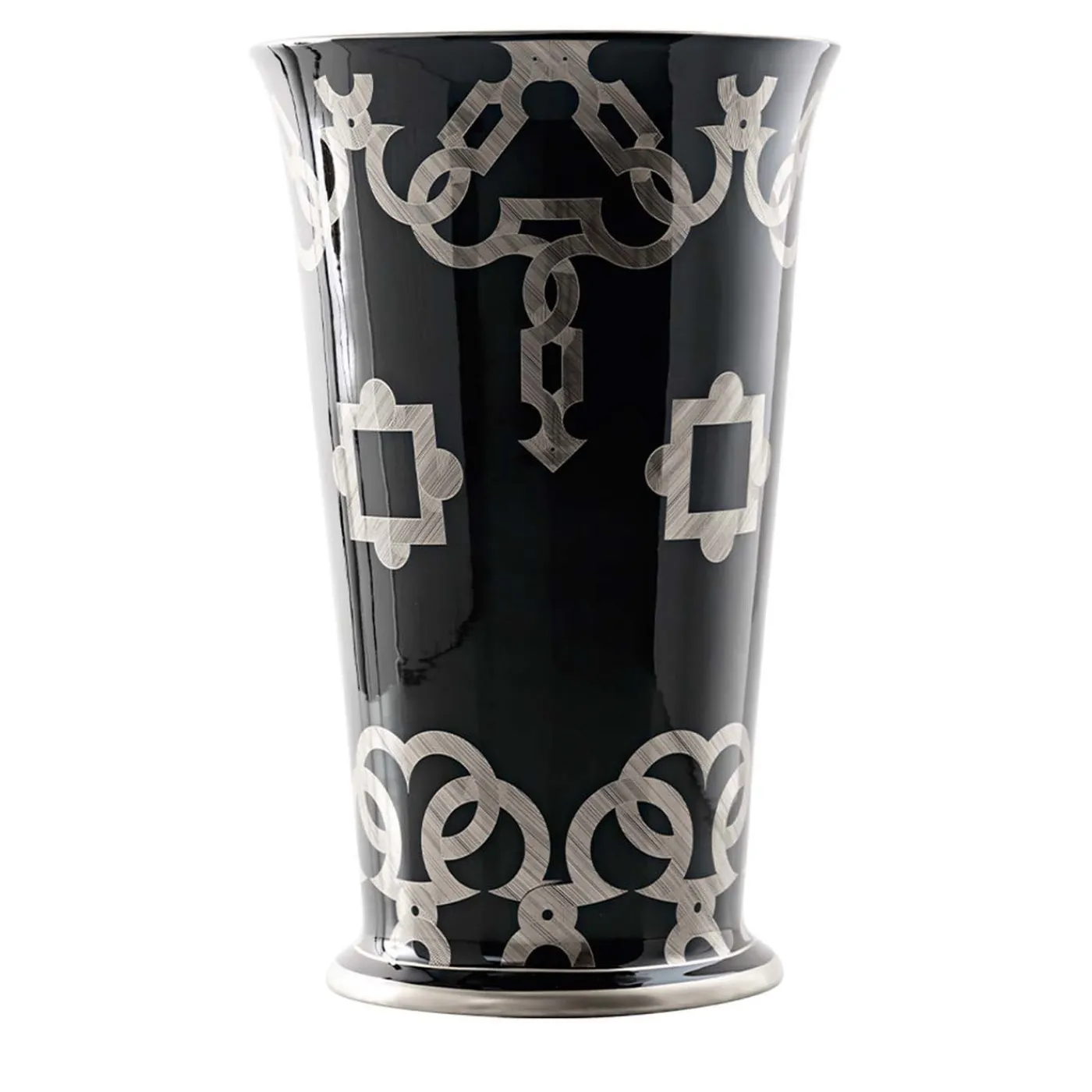 Questo raffinato vaso in porcellana fonde brillantemente il fascino seducente della porcellana nera dipinta con il fascino lussuoso del platino. Definito dall’armonia senza sforzo di linee morbide, questo pezzo si distingue per le sofisticate incisioni geometriche del platino che adornano la sua silhouette in un design perfettamente simmetrico.