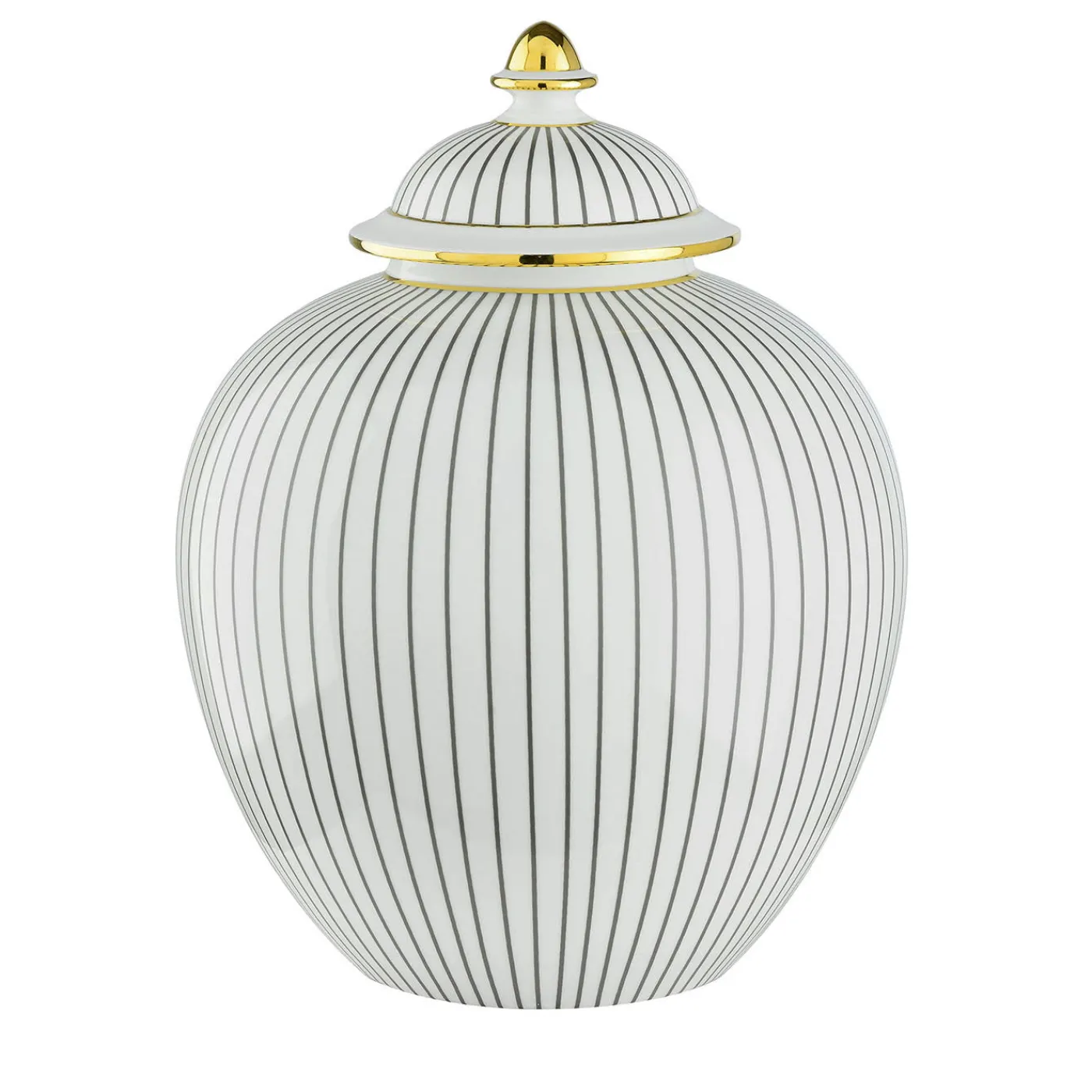 L’impareggiabile raffinatezza di questa potiche in porcellana risiede in un equilibrio impeccabile di semplicità e opulenza. Perfetto complemento per gli arredamenti classici, dove svolge con la stessa facilità una funzione pratica e decorativa, questo pezzo esclusivo con coperchio abbinato vanta una silhouette rigonfia e candida, interrotta solo da sottilissime strisce verticali color antracite accostate a luminosi accenti dorati.