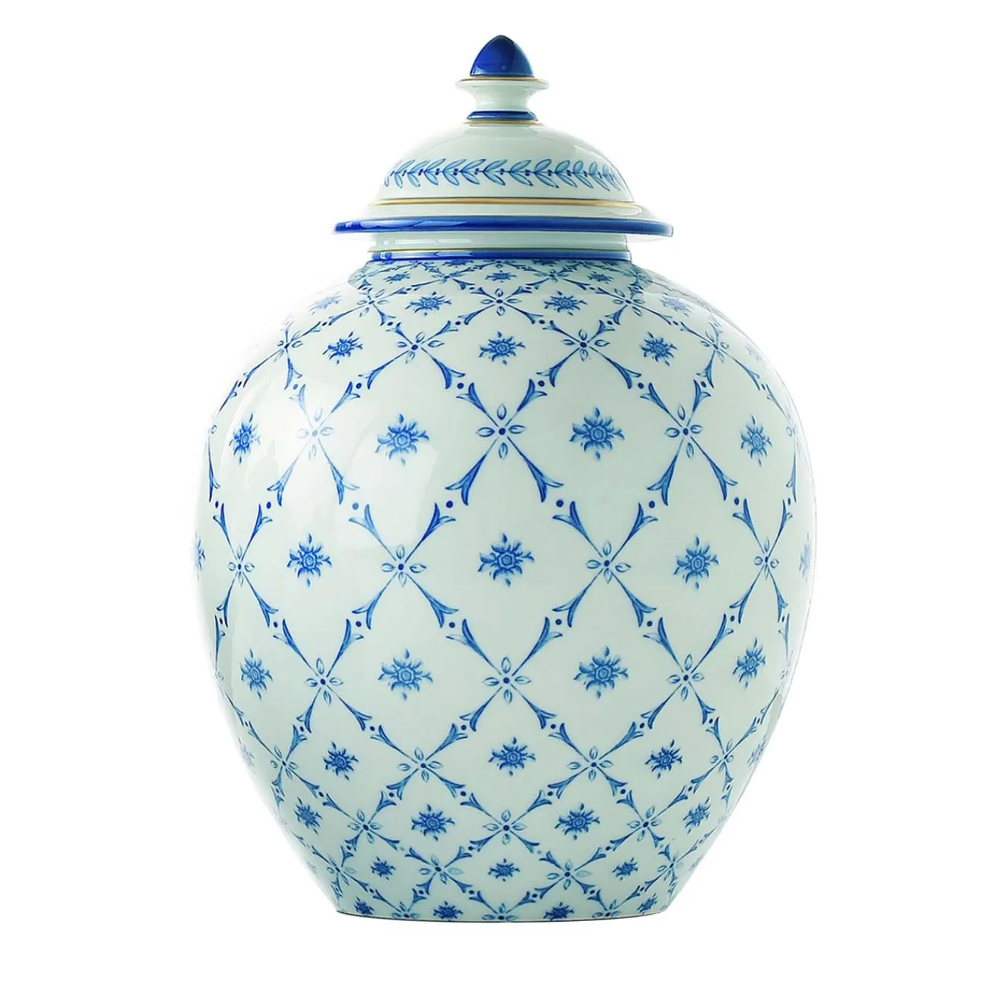 In questa superba potiche il fascino inconfondibile della porcellana bianca incontra un accattivante motivo floreale blu disposto a rete romboidale. Dotato di un coperchio coordinato, questo squisito oggetto d’arredo funzionale presenta una silhouette arrotondata e minuziosamente realizzata in porcellana di prima qualità, che si abbina a decori raffinati e neutri.