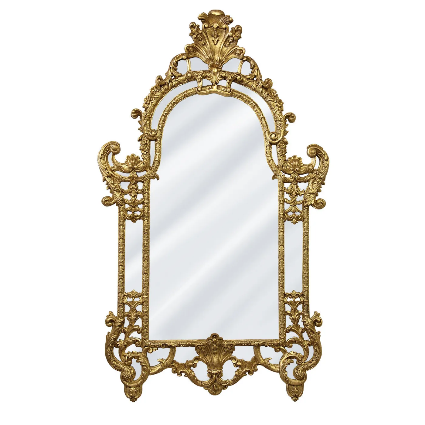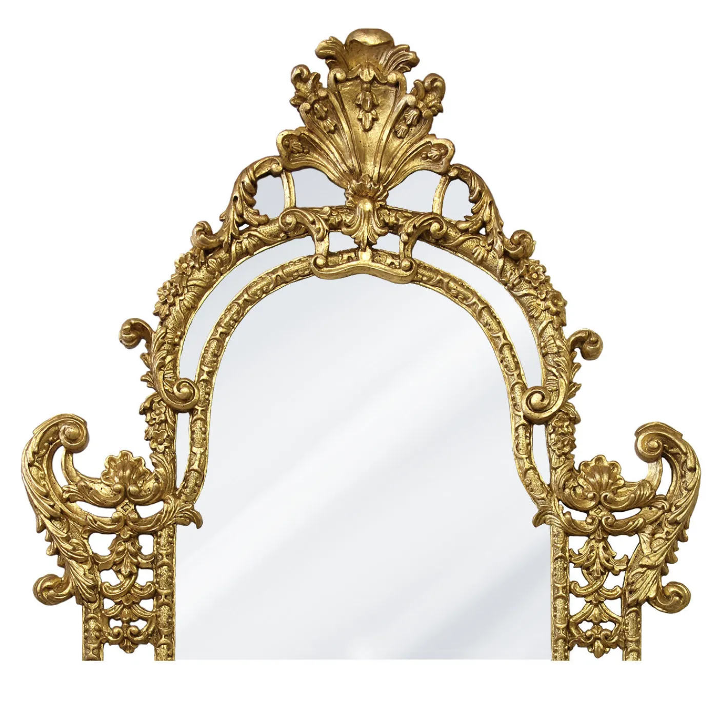 Questa magnifica cornice è stata intagliata a mano su legno antico. Ogni fase della lavorazione di questo pezzo è stata eseguita con tecniche antiche conosciute fin dal XIV secolo, dalla preparazione alla doratura in oro zecchino a 22 carati utilizzando solo materiali naturali, alla finitura e alla patina finale di invecchiamento aggiunta. Parte di una collezione esclusiva di soli due pezzi, questo specchio incorniciato creerà un effetto sorprendente in qualsiasi ambiente venga collocato.