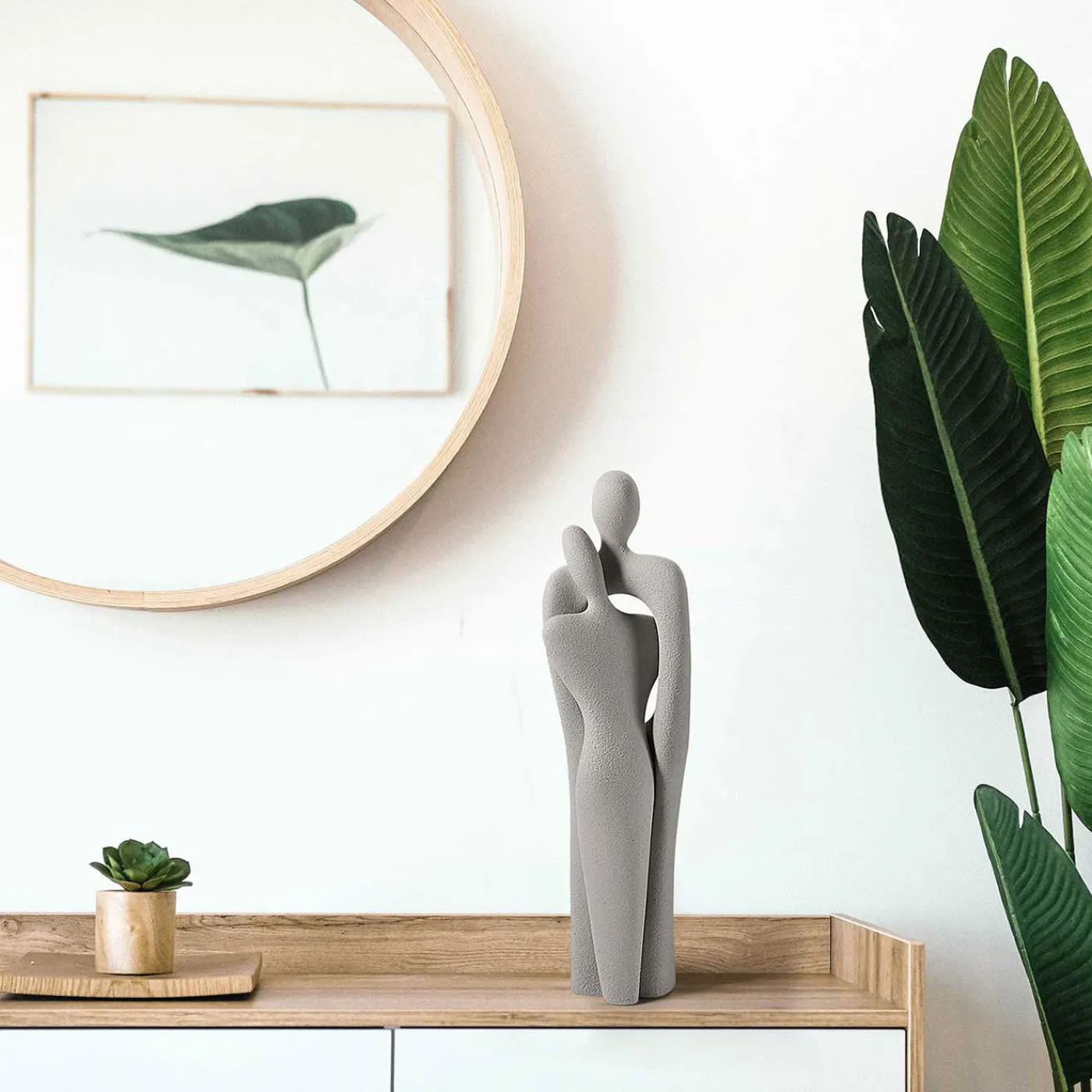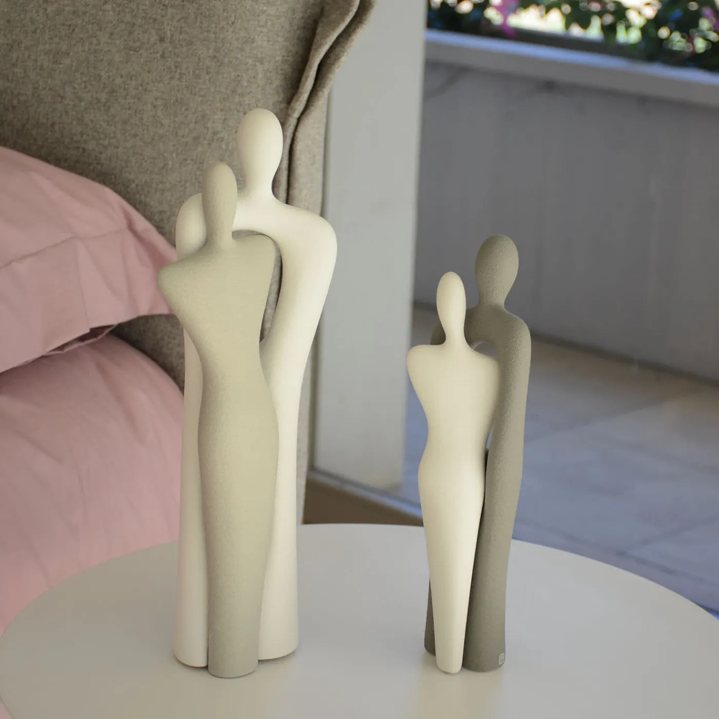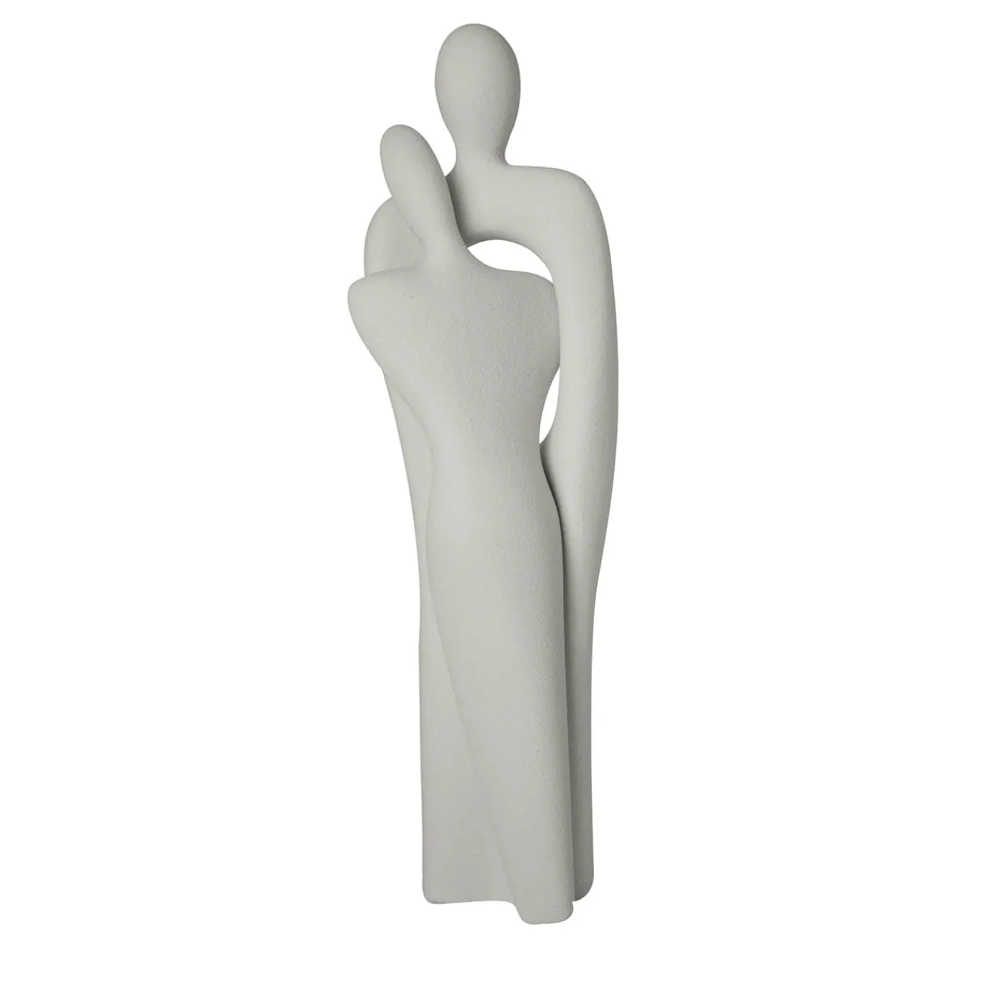 L’unione di due corpi: due figure stilizzate che si abbracciano così strettamente da diventare quasi una cosa sola. Un momento senza tempo. La dimensione estetica dell’abbraccio, che avvicina, risolve le tensioni, annulla le distanze.