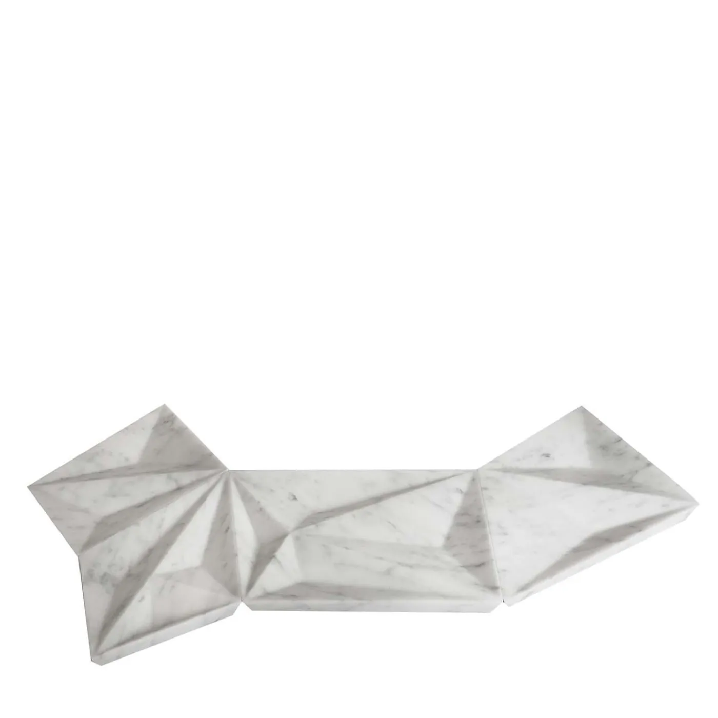 Questo centrotavola glamour comprende quattro vassoi di dimensioni diverse, da piccole a extra-large (28x18xH3 cm, 32x21xH3 cm, 134x25xH3 cm e 138x25xH3 cm, con un peso rispettivamente di 3, 3, 4,6 e 6,3 kg). Realizzate in marmo bianco di Carrara con le tipiche striature grigio chiaro, queste dune angolari dalle linee scolpite possono essere disposte in infinite varianti, creando così nuovi e affascinanti decori.