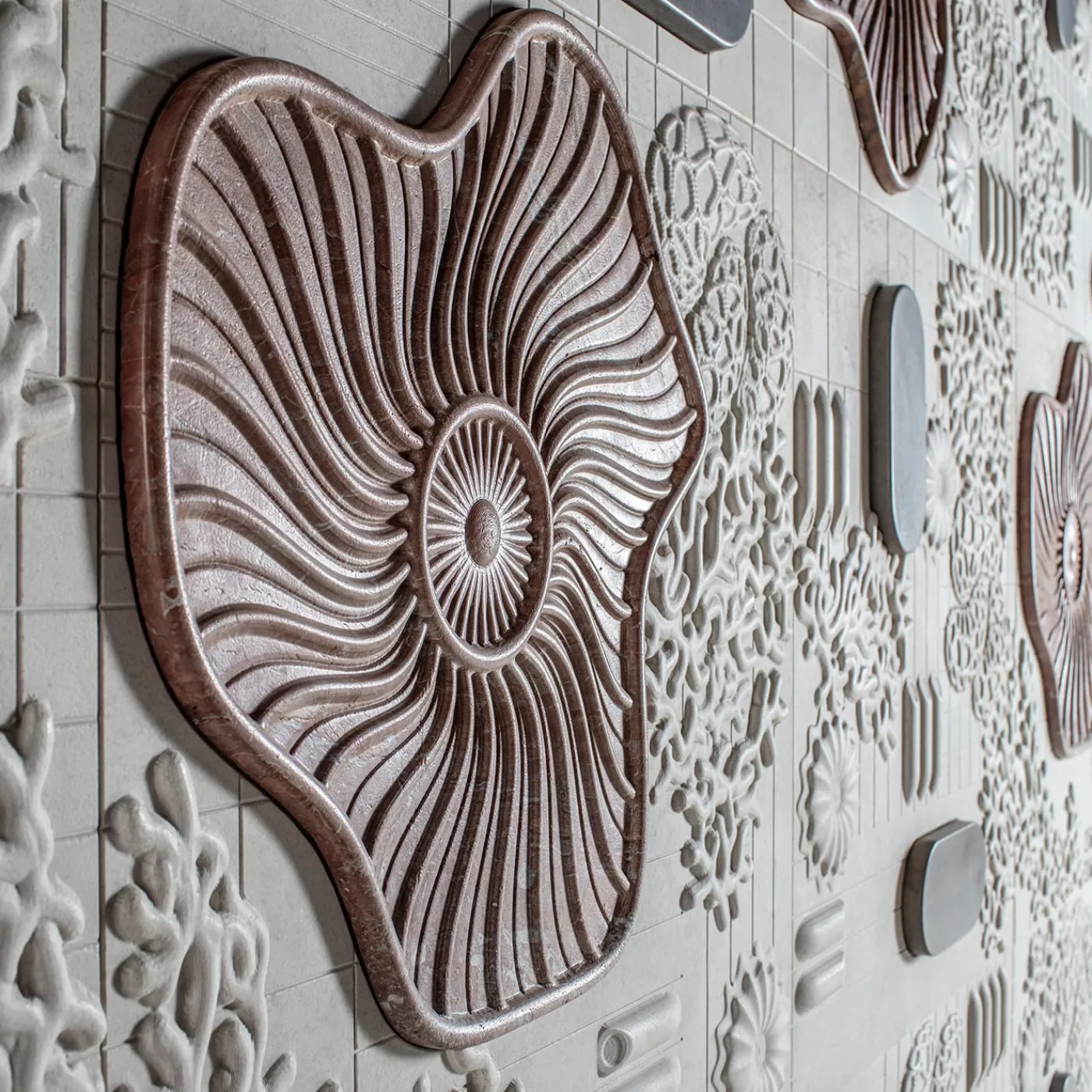 La collezione Anemone è incentrata sul paesaggio marino. Attraverso il suo linguaggio creativo unico, Elena Salmistraro interpreta le misteriose creature che abitano le profondità marine. Anemone è un pannello decorativo modulare in marmo che stratifica piante, molluschi e organismi viventi su una griglia di coordinate geografiche, creando una composizione dinamica che si estende dai fondali marini alle sagome stilizzate delle barche.