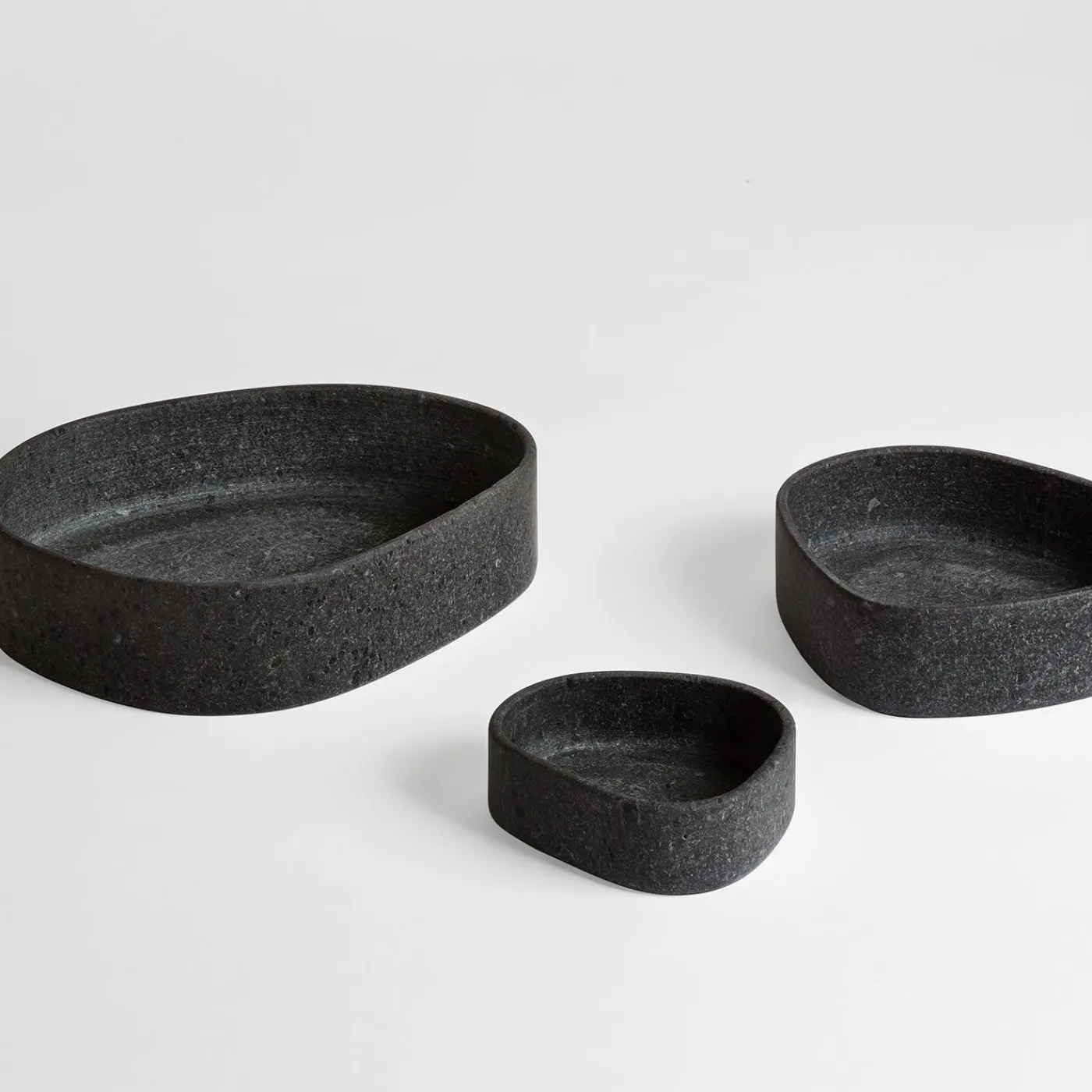 Questo elegante set di ciotole impilabili è realizzato in pietra lavica nera. La superficie organica e i bordi arrotondati di ogni pezzo creano affascinanti silhouette. Il contenitore piccolo misura 12x11xH4 cm, quelli medi e grandi 17x16xH5 cm e 24x20xH6 cm. È disponibile anche una versione bianca in marmo di Carrara.