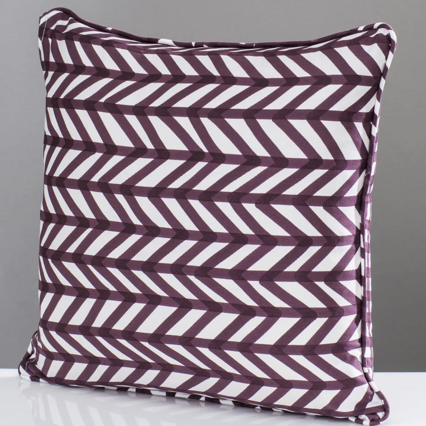 Questo elegante cuscino è dotato di un inserto in piuma d’oca e di una fodera in 100% cotone decorata con la tecnica della stampa a pigmenti con un suggestivo motivo a spina di pesce di colore marrone.
