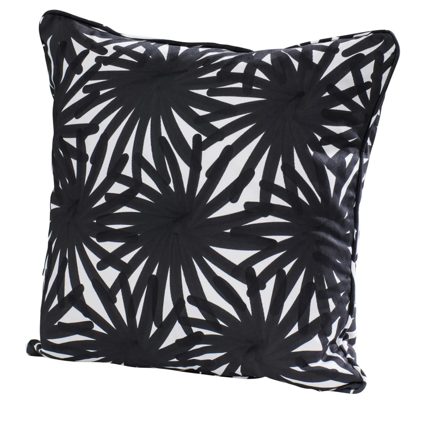Questo cuscino di grande effetto ha un inserto in piuma d’oca e una fodera in 100% cotone decorata con la tecnica della stampa a pigmenti con un motivo di fuochi d’artificio neri su sfondo bianco.