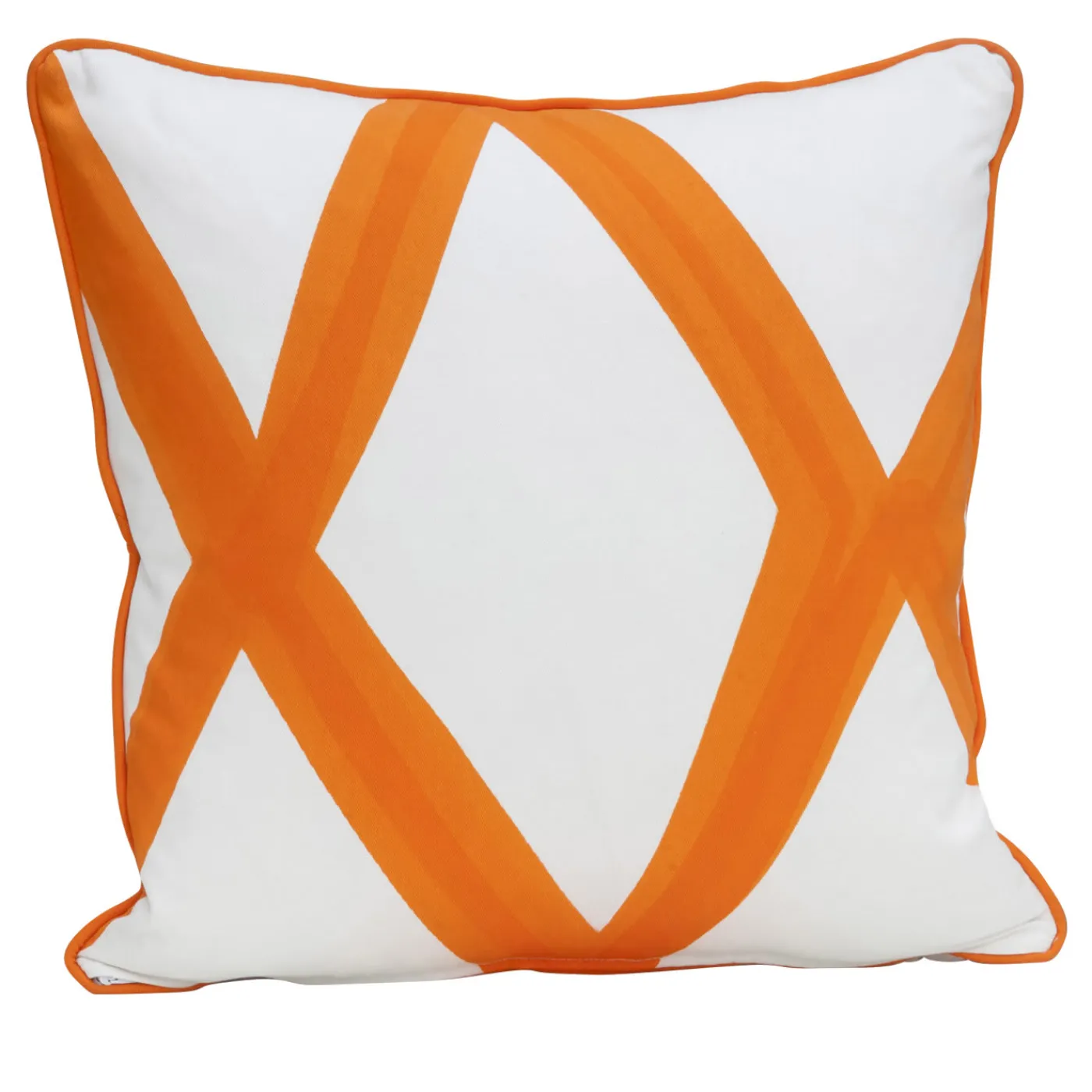 Questo elegante cuscino è dotato di un inserto in piuma d’oca e di una fodera in 100% cotone decorata con un suggestivo motivo di diamanti in arancione vivo su sfondo bianco.