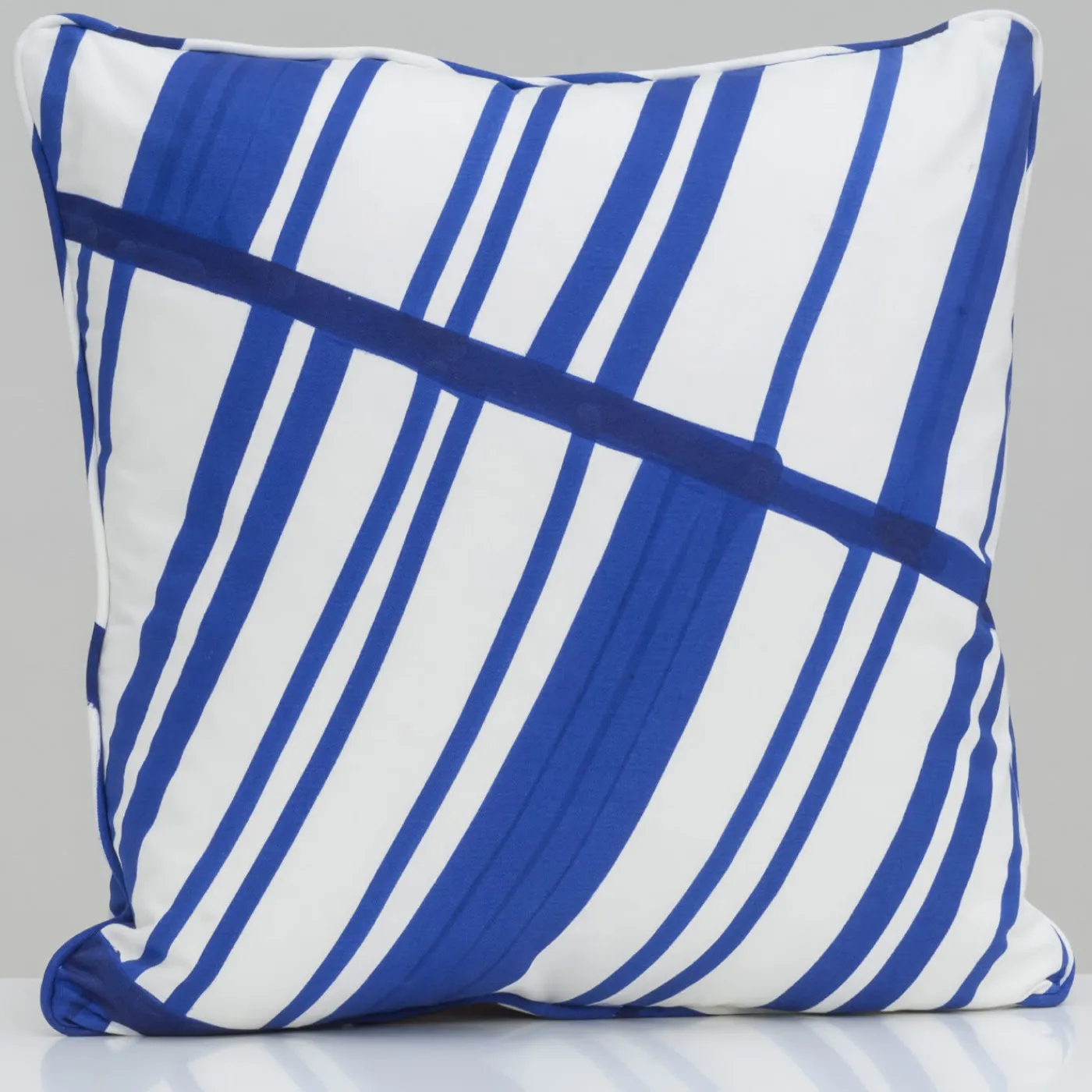 Questo elegante cuscino è dotato di un inserto in piuma d’oca e di una fodera in 100% cotone decorata con la tecnica della stampa a pigmenti con linee blu parallele e perpendicolari su sfondo bianco.