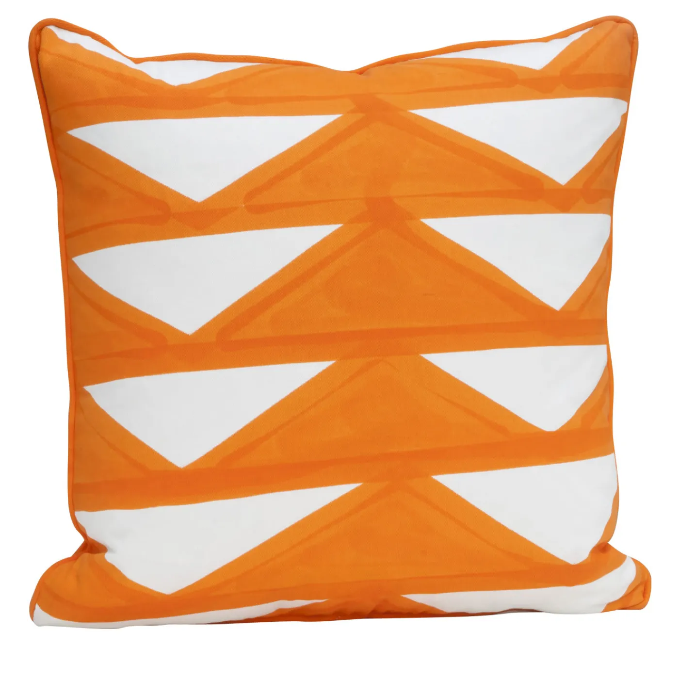 Questo cuscino di grande effetto ha un inserto in piuma d’oca e una fodera in 100% cotone decorata con un motivo di triangoli in arancione vivo su sfondo bianco.