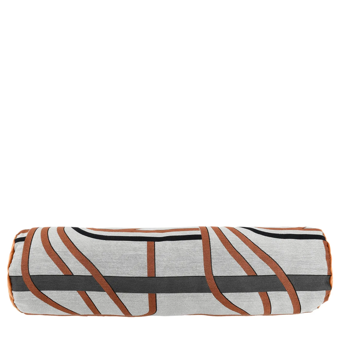 Un cuscino a rullo realizzato con tessuti in jacquard e velluto di cotone caratterizzato da un motivo geometrico con accenti in terracotta e nero. Progettato per un uso decorativo su letti e divani, include una chiusura con zip su misura e un’imbottitura ipoallergenica. Privo di formaldeide, combina un raffinato tessuto intrecciato con comfort e sicurezza, elevando qualsiasi interno con un tocco di artigianato elegante.
