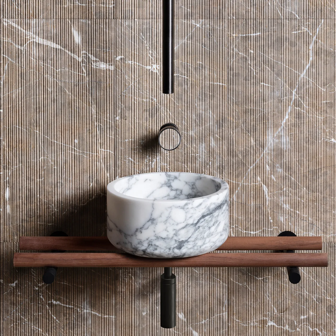 Il lavabo da appoggio Tube presenta un design compatto e salvaspazio che bilancia semplicità ed eleganza, riducendo la forma alla sua essenza più pura. La sua vasca arrotondata con base smussata sembra galleggiare sopra doppi listelli di legno paralleli, che possono essere abbinati a vassoi portatili dotati di maniglie per uno stoccaggio versatile e facile riorganizzazione. Ideale per ambienti residenziali e di ospitalità dove la gestione dello spazio è essenziale. Contattare il Concierge per ulteriori dettagli.