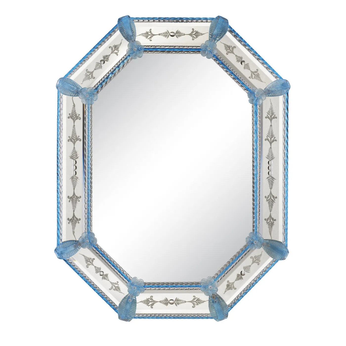 Incorniciate la vostra casa con il tradizionale stile veneziano con lo specchio da parete Calle Octa. Su una cornice in legno dipinto, lo specchio presenta incisioni in argento e delicati accenti in vetro azzurro e trasparente. Perfetto per ingressi e saloni, lo specchio è la testimonianza di secoli di tradizione vetraria.