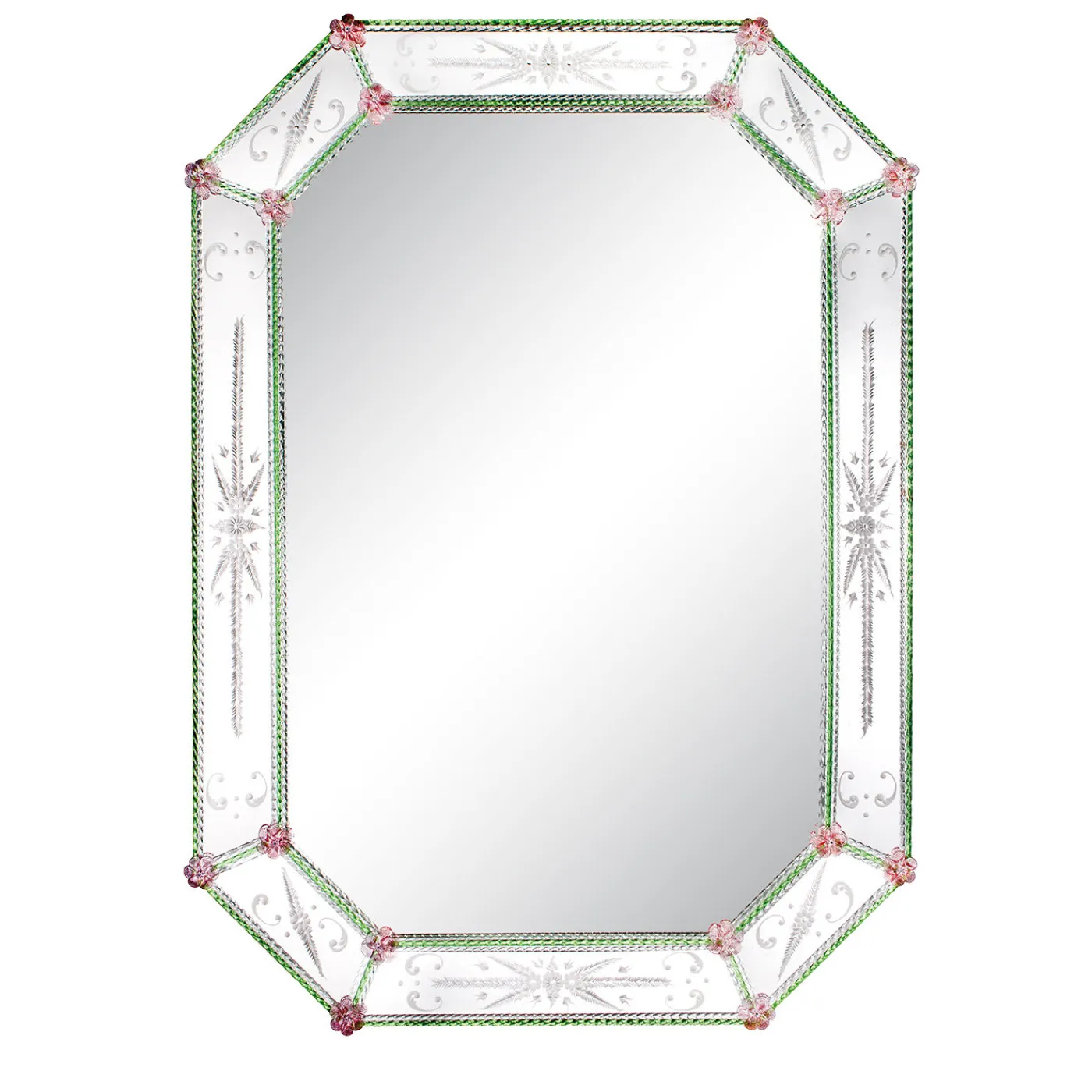 Un capolavoro di vetro, argento e legno, realizzato a mano a Venezia. Testimonianza della secolare tradizione vetraria della città, lo specchio da parete Calle Olga prende il nome da una delle vie della città. Con una cornice in legno dipinto, lo specchio è arricchito da incisioni in argento e da vetri verdi e rosa che formano un motivo floreale.