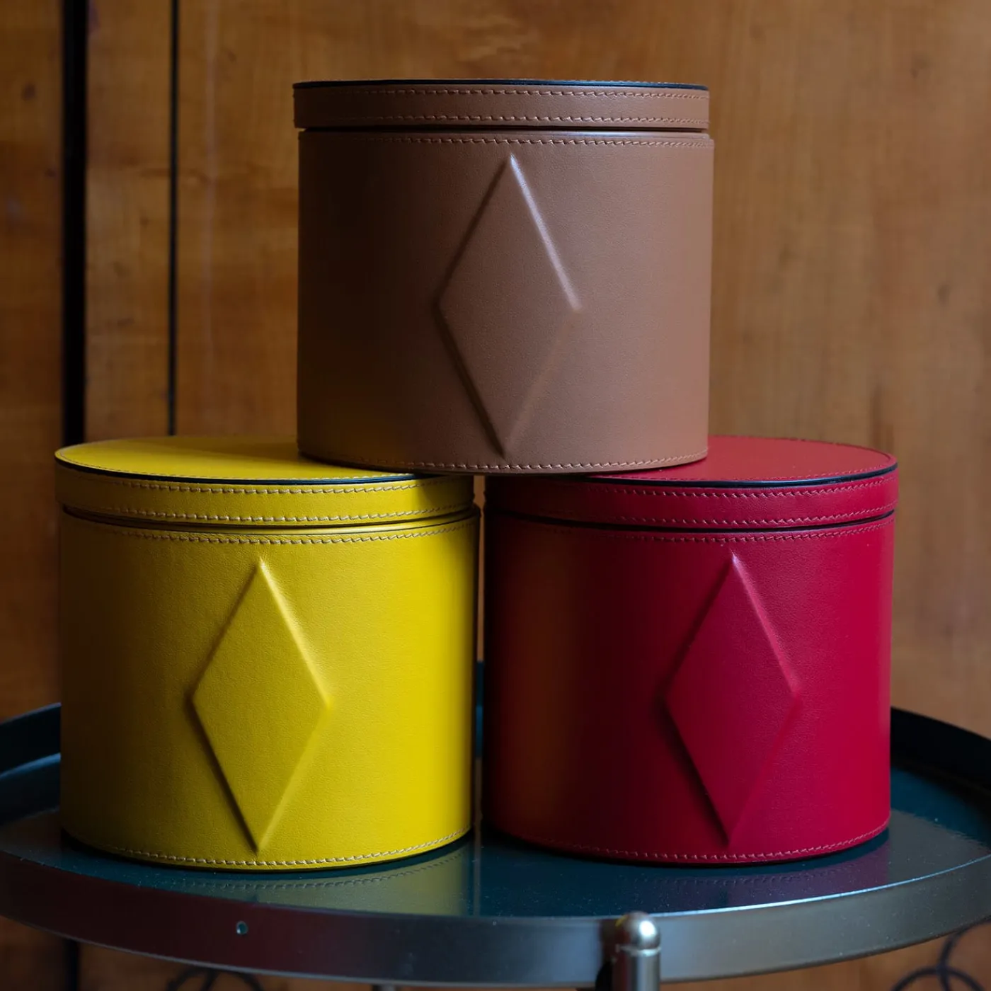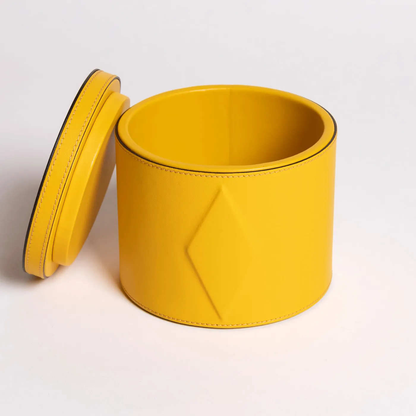 Scatola interamente rivestita in pelle con un motivo geometrico in rilievo, leitmotiv di Luhdo. Un oggetto per sé o un regalo esclusivo in cui riporre i propri oggetti o come complemento d’arredo.