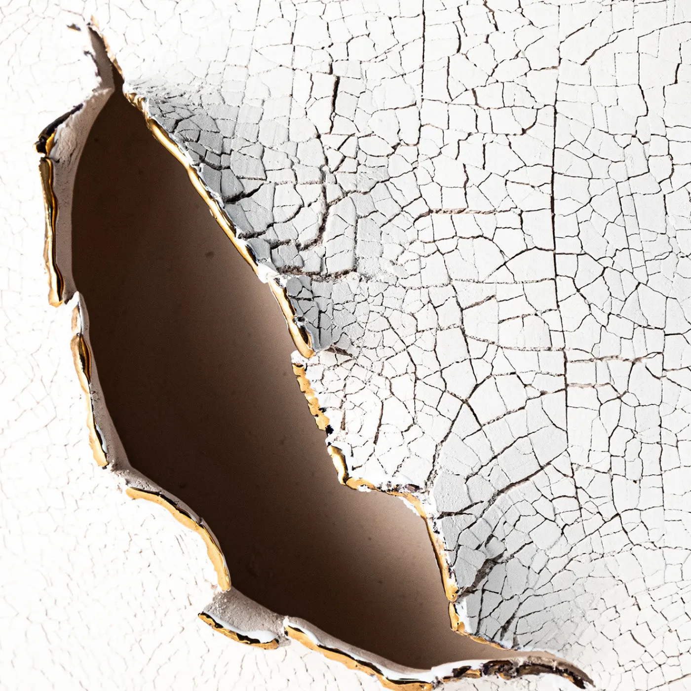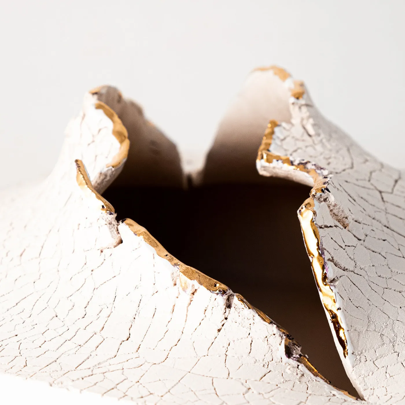 Opera d’arte mozzafiato, questa scultura in ceramica appartiene alla Collezione Cretto. Ispirato alle fessure naturali della Terra (“cretto” in italiano), questo contenitore presenta una forma parallelepipeda rifinita con uno smalto bianco la cui superficie è stata smaltata con silicato di sodio e cotta per creare una straordinaria texture granulosa e screpolata. La magnifica fessura vulcanica è impreziosita da dettagli in oro.