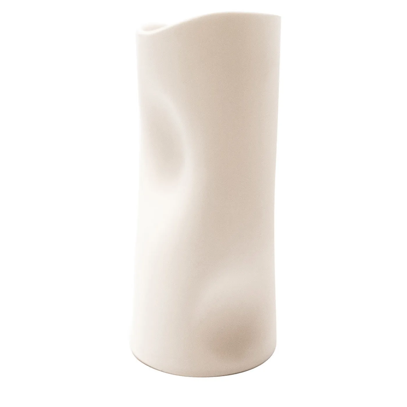Raffinato pezzo decorativo per qualsiasi spazio contemporaneo, questo splendido vaso decorativo bianco seta è un singolare pezzo d’arte scultorea in ceramica italiana. Con una silhouette cilindrica allungata e sinuosa, ispirata alle curve naturali di un tronco d’albero, questo straordinario oggetto d’arte è interamente scolpito a mano con un processo di lavorazione del gres a pasta colorata. Così come non esistono due alberi uguali, non esistono due sculture uguali di questa collezione.