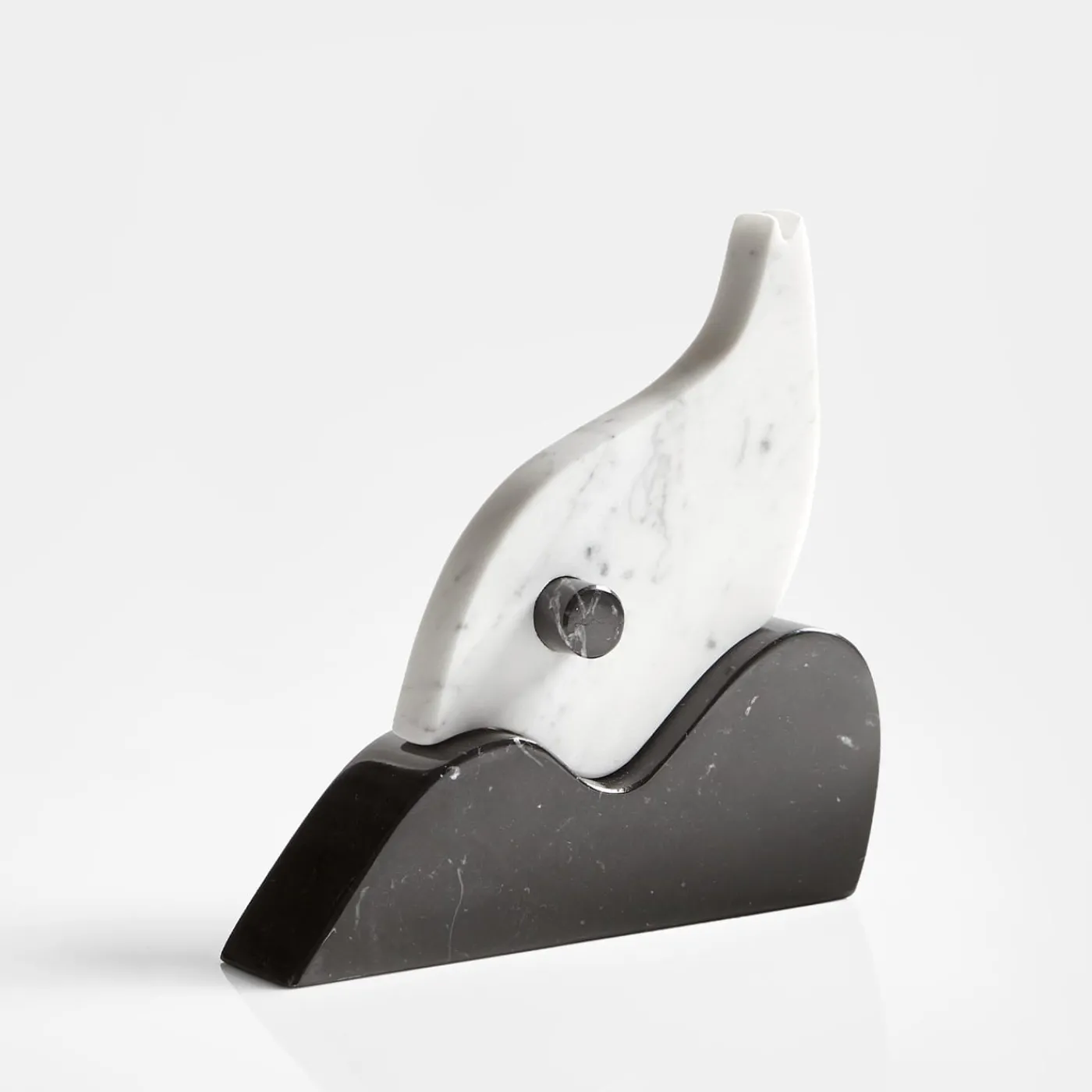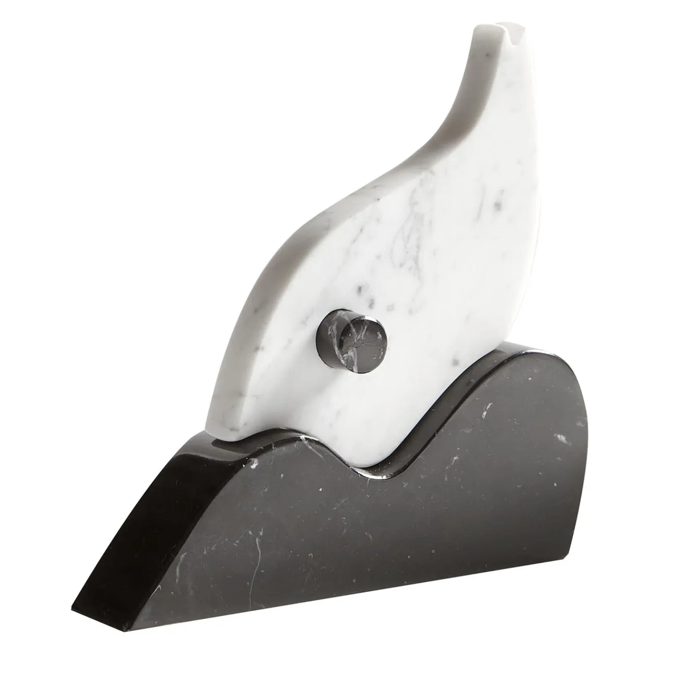 Donzella Pavonina, nome di un coloratissimo pesce dei mari italiani, riprende il tema di una scultura itinerante e fa parte della collezione “Marble In Scatola”. Il pesciolino cavalca un’onda di marmo ed è dotato di un occhietto che si inserisce a mano. La scomponibilità vuole essere un gioco che unisce le varie essenze del marmo e ne fa percepire la diversità. È realizzato a mano in marmo bianco di Carrara e nero di Marquina.