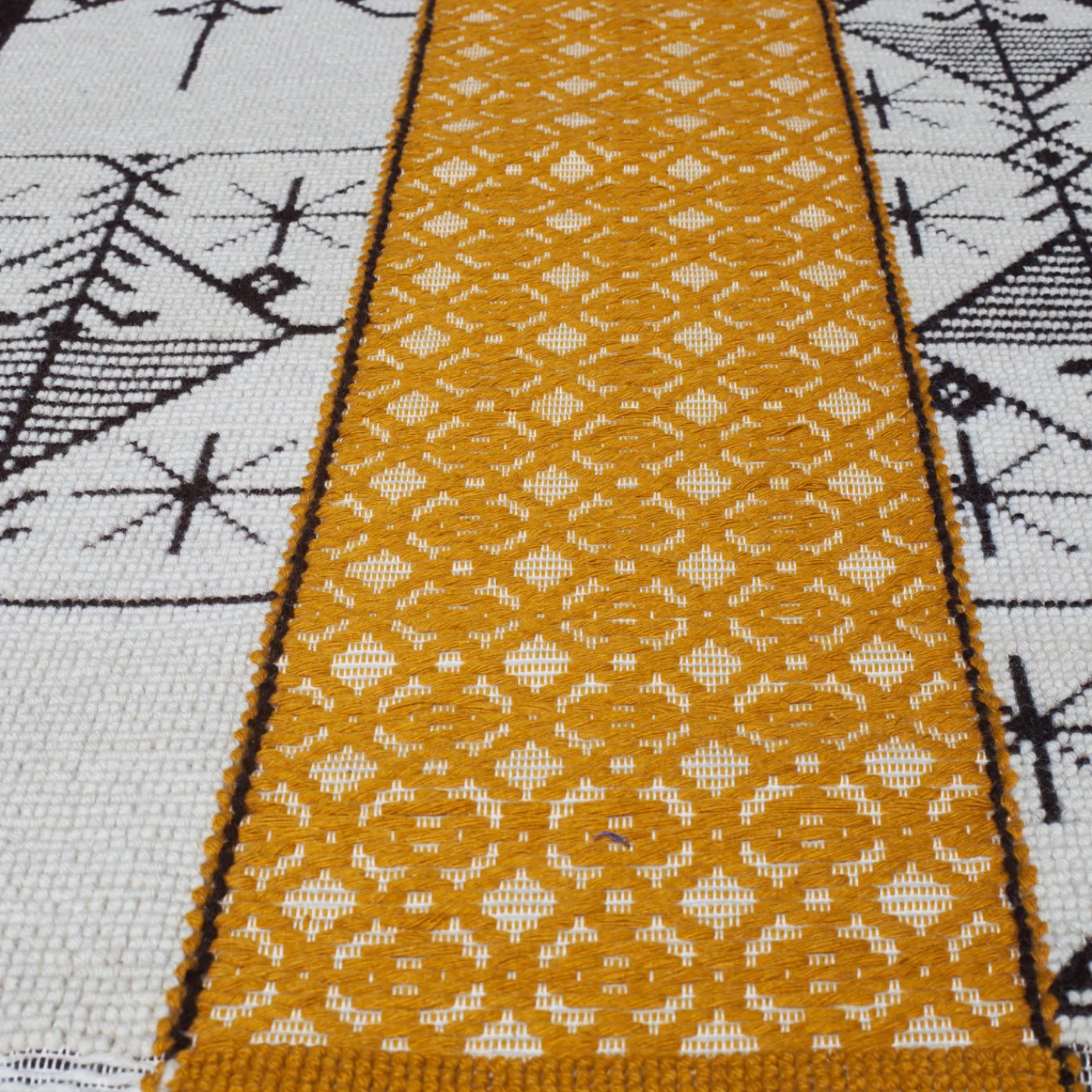 L’esperta lavorazione a mano si è unita alla visione del designer in questa straordinaria opera d’arte, che funziona anche come tappeto. Gli elementi grafici che formano motivi geometrici su questo pezzo sono completati dalla morbidezza del filato di lana e dall’intricatezza dell’intreccio stesso. I simboli di quest’opera sono riconducibili a immagini iconiche utilizzate nella tessitura tradizionale dei tappeti. Le diverse tonalità di bianco e nero, accentuate da un giallo intenso, creano una tavolozza di colori sofisticata, adatta a qualsiasi arredamento.