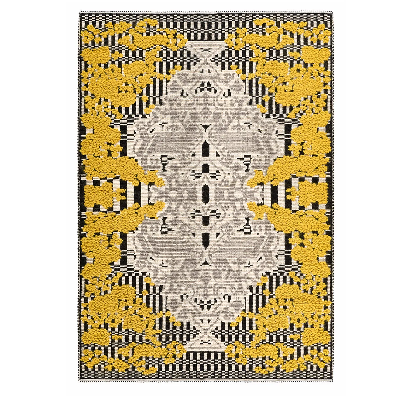 Questo tappeto eleva immediatamente l’arredamento di qualsiasi stanza in cui viene collocato. La tecnica “Pibiones”, ottenuta utilizzando tre livelli di filato, conferisce una sensazione tridimensionale a questo oggetto funzionale e decorativo. I vari disegni di questo tappeto rappresentano lo sbocciare dei fiori in un giardino. La pura lana sarda utilizzata richiama le tradizioni della regione, pur mantenendo un’impronta contemporanea nella palette di colori composta da avorio, grigio e nero.