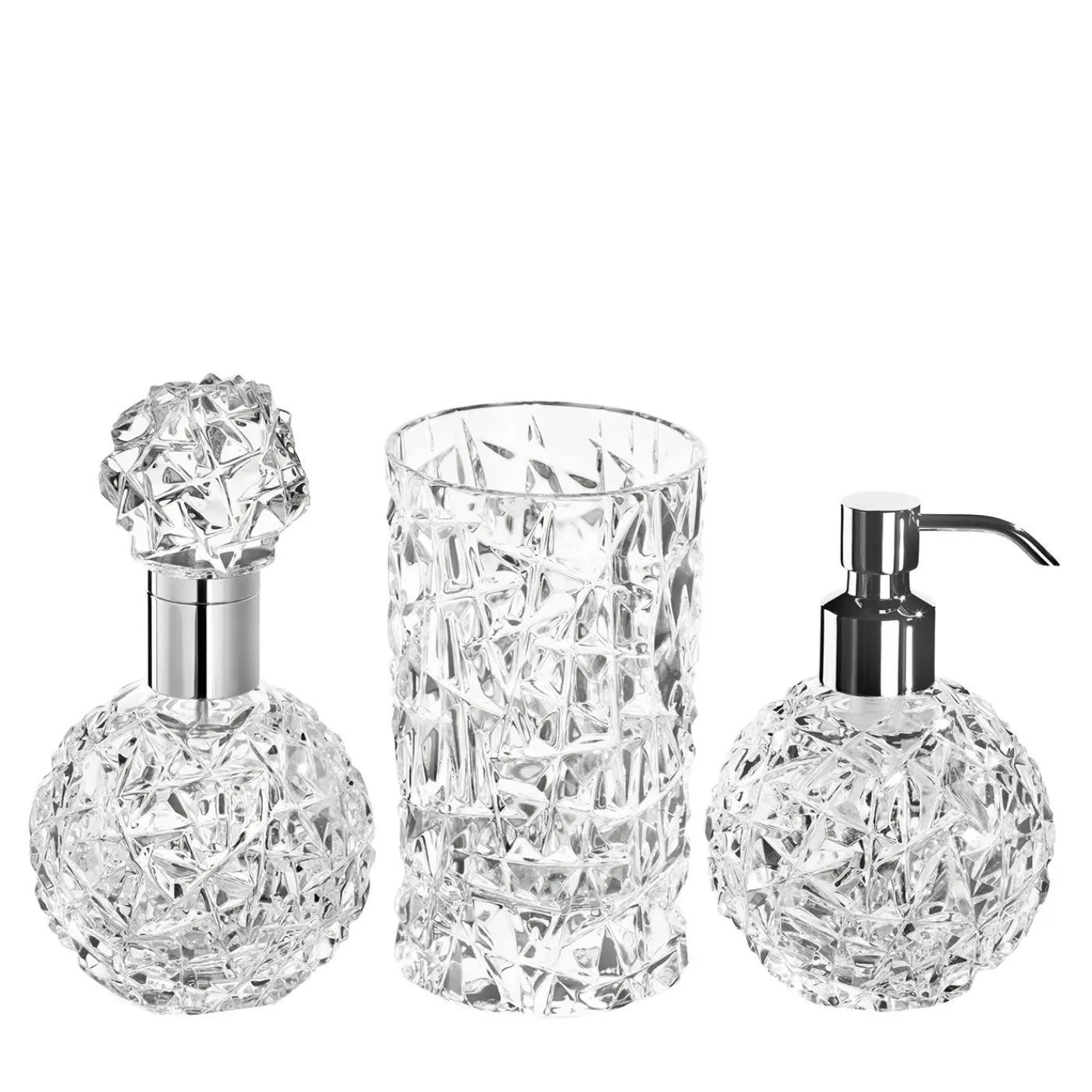 Questo set, che fa parte della collezione Spa Sinfonia, è un’aggiunta straordinaria a una toilette o a un bagno, dove la straordinaria texture che adorna i pezzi di vetro trasparente scintilla nella luce circostante, creando un ambiente lussuoso. Da solo o in combinazione con gli altri articoli della serie, questo set si farà notare. Comprende: una bottiglia di profumo (L 10 cm e H 19 cm), un portaspazzolino (L 7,8 cm e H 12 cm) e un dispenser di sapone (H 15 cm).