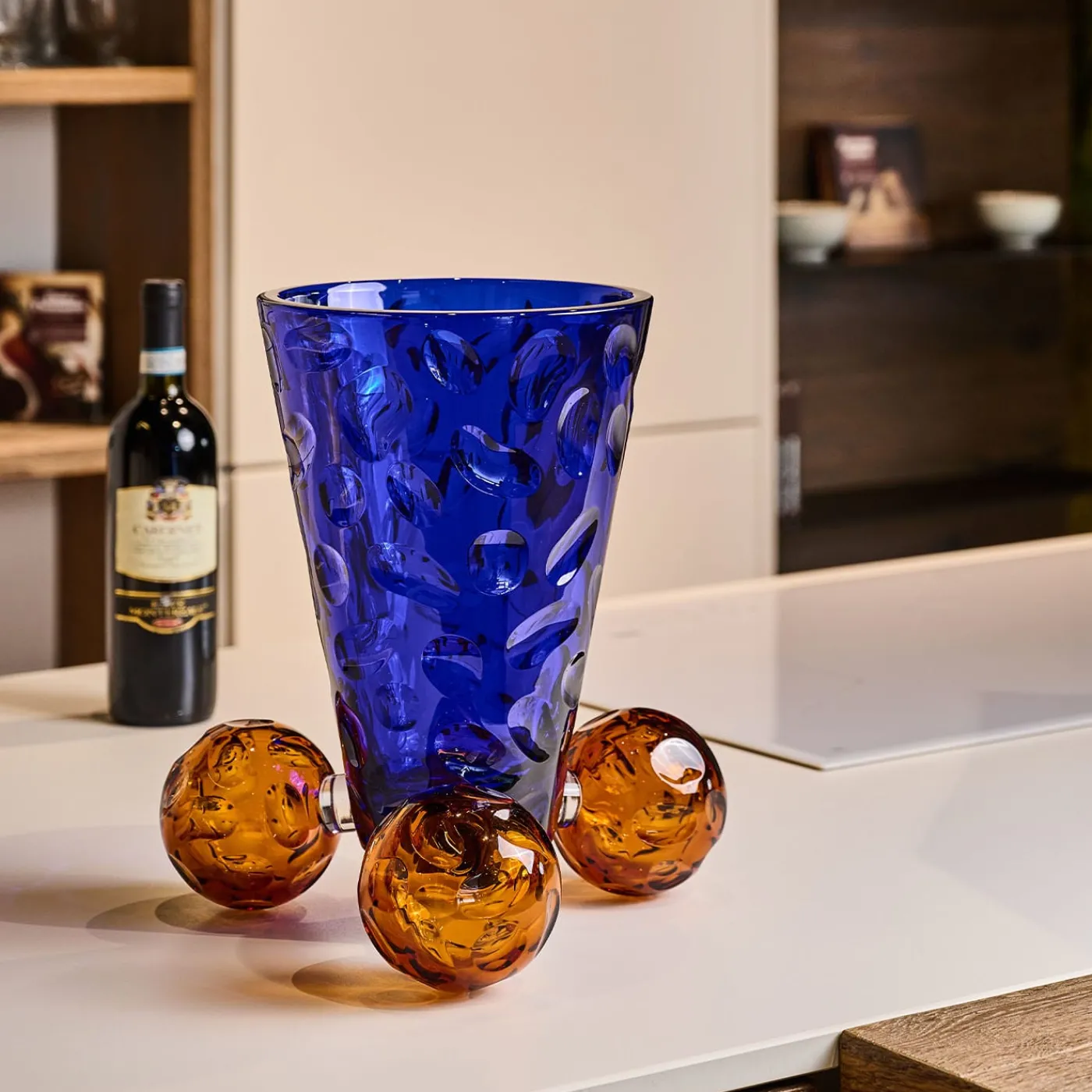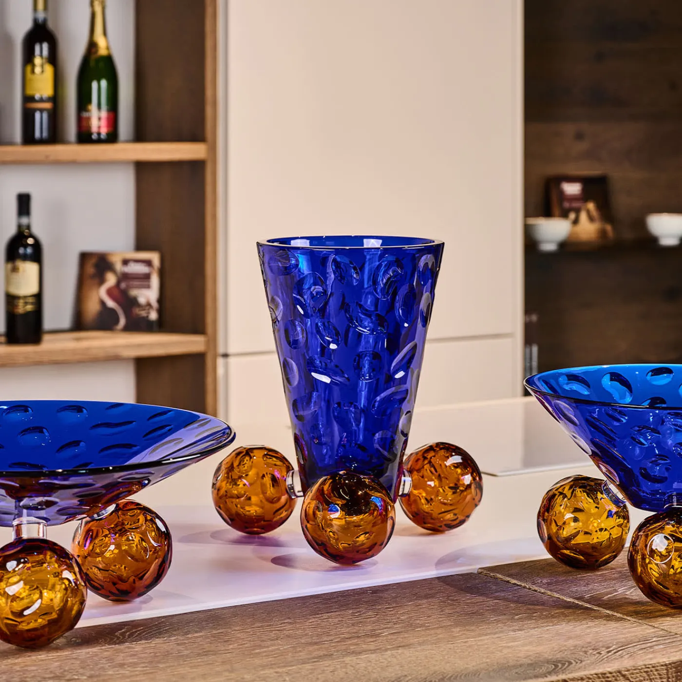 Bubbles Suspended Bowl rappresenta un vaso per così dire sospeso. Questo oggetto è realizzato secondo l’idea di equilibrio e sospensione. L’idea di sospensione conferisce a questi oggetti un’aura di leggerezza e grazia. Bubbles Suspended Vase è il vaso che esprime il movimento dei corpi, rimanendo fermo, sia per la fluidità dell’incisione che per il colore blu intenso.