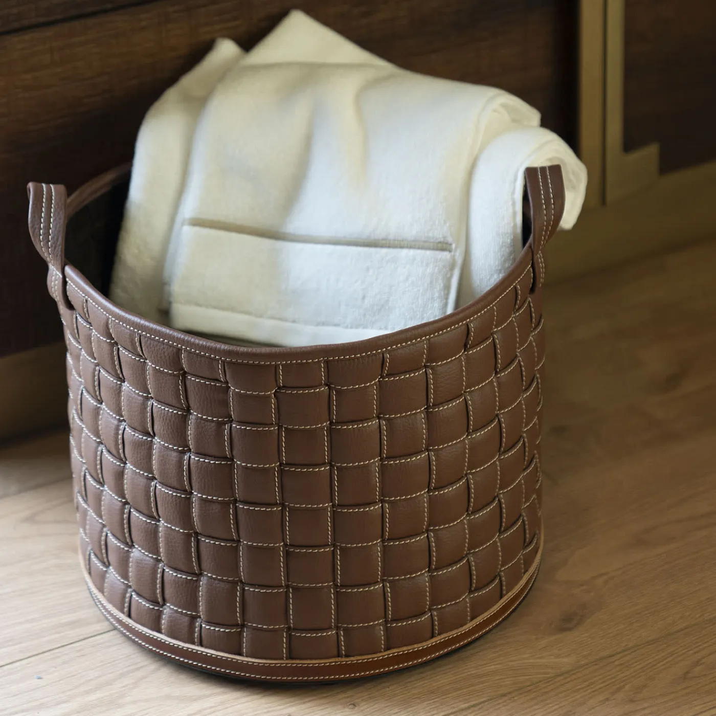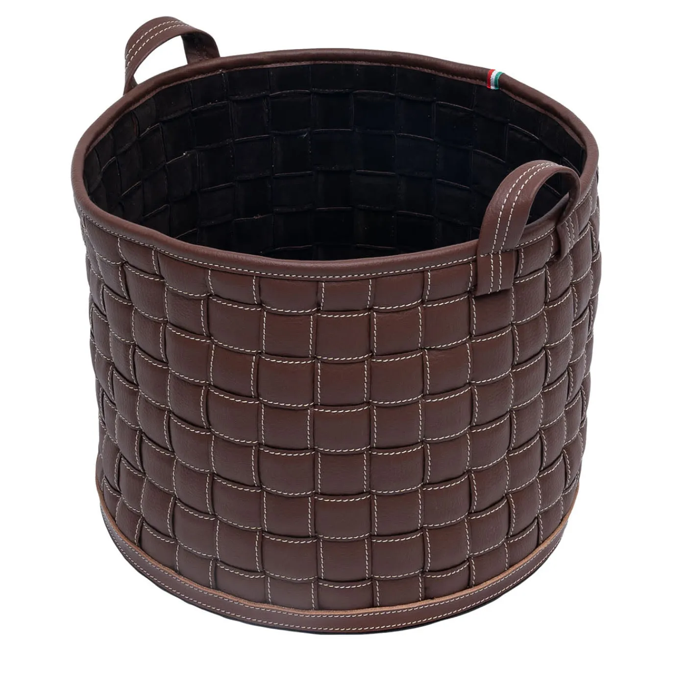 Un trionfo di fasce di ecopelle di prima qualità in una ricca tonalità di marrone sono intrecciate insieme per creare questo esclusivo cestino. Il suo design, di pura eleganza sartoriale – esaltata dalle cuciture a contrasto – è concepito per raccogliere oggetti altrimenti sparsi o riviste con una classe inaspettata. I piccoli piedini permettono al cestino di evitare il contatto diretto con superfici umide o sporche. Sono disponibili più varianti di dimensioni e colori.