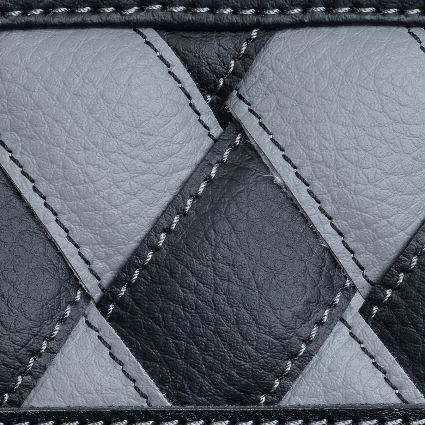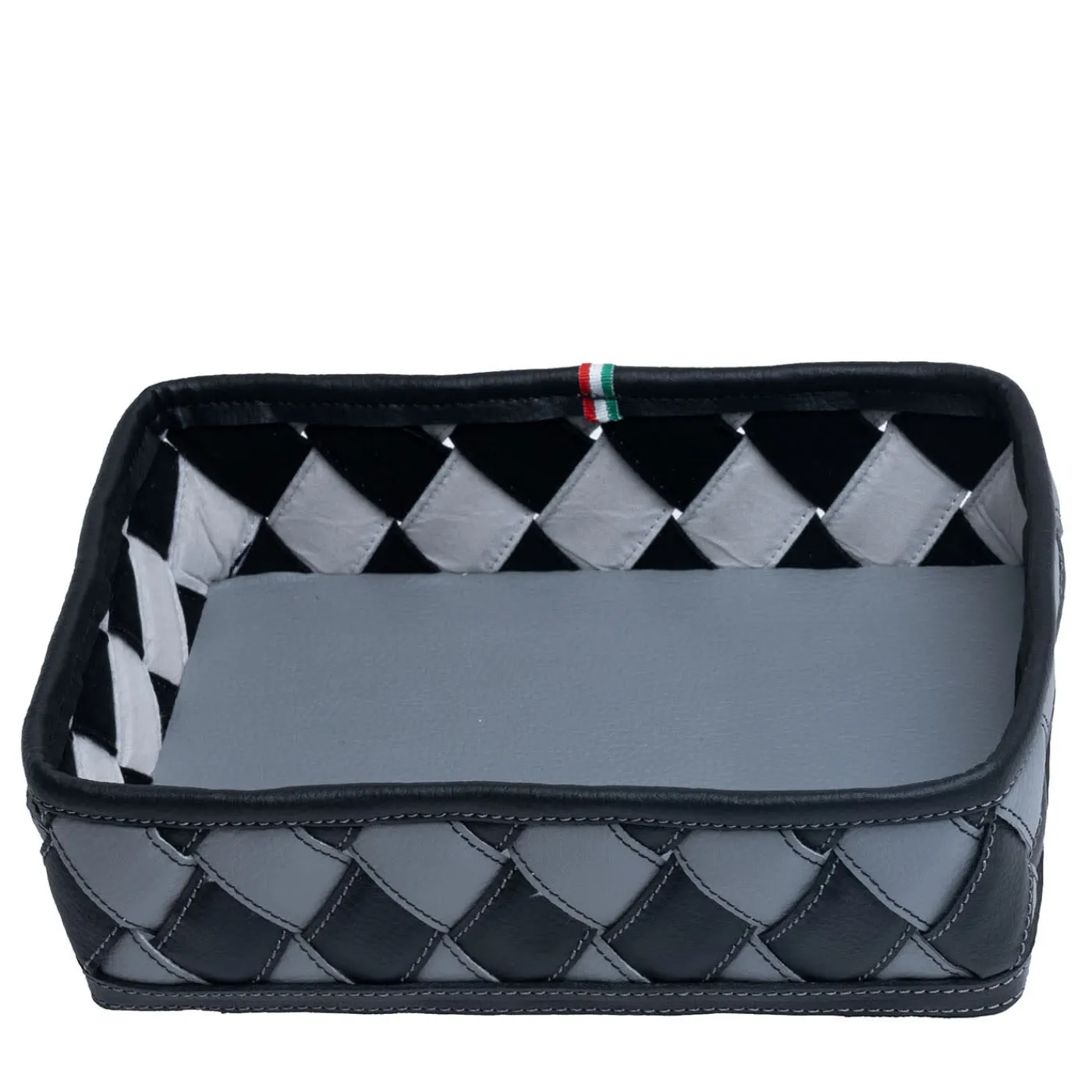 Appagante alla vista e al tatto, questa sofisticata videopoche si distingue per il suo design a scacchiera ottenuto annodando fasce di ecopelle nei toni contrastanti del grigio e del nero. Mentre i dettagli ne rivelano l’inconfondibile allure sartoriale, il solido fondo interno assicura stabilità e resistenza. Ideale per raccogliere oggetti altrimenti sparsi sulla scrivania senza rinunciare all’eleganza, è disponibile anche in diverse dimensioni e colori.