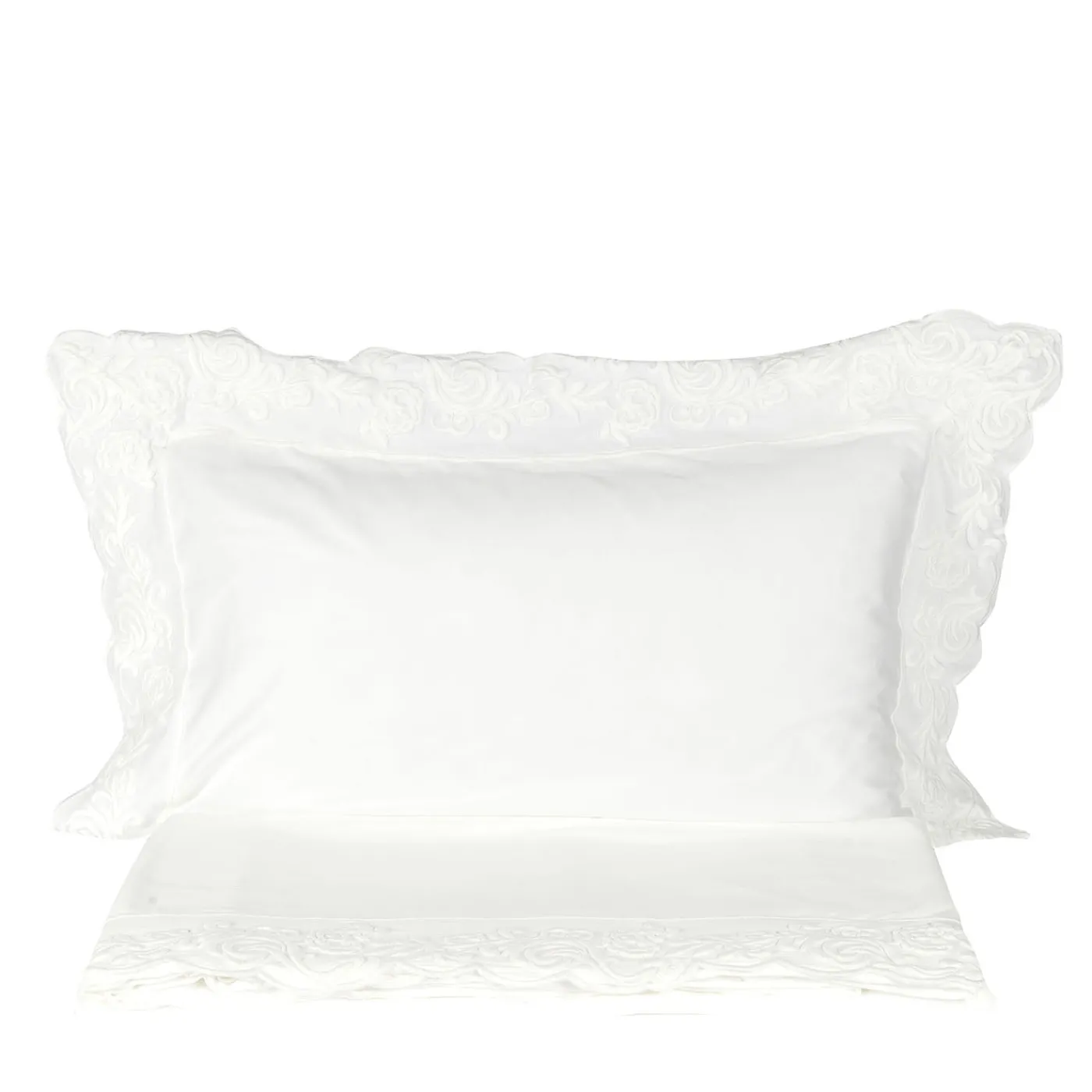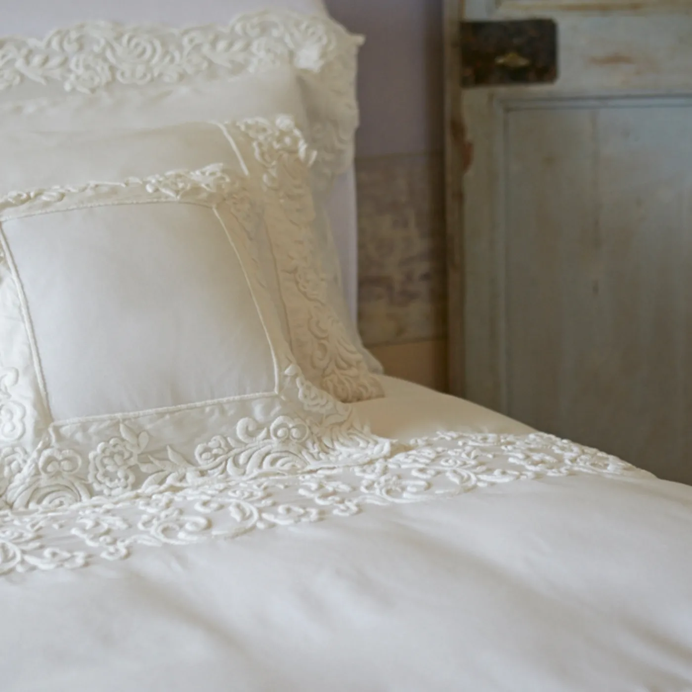 Il set di lenzuola Dune Merveille è realizzato in cotone tinto in capo, offrendo un eccezionale morbidezza e una piacevole sensazione al tatto. Caratterizzato da un polsino ricamato e federe con tripli volant e delicati ricami, combina dettagli raffinati con un lusso sobrio. Include un lenzuolo sopra (265×290 cm), due federe con 3 volants (50×80 cm) e un lenzuolo sotto con orli semplici (265×290 cm).