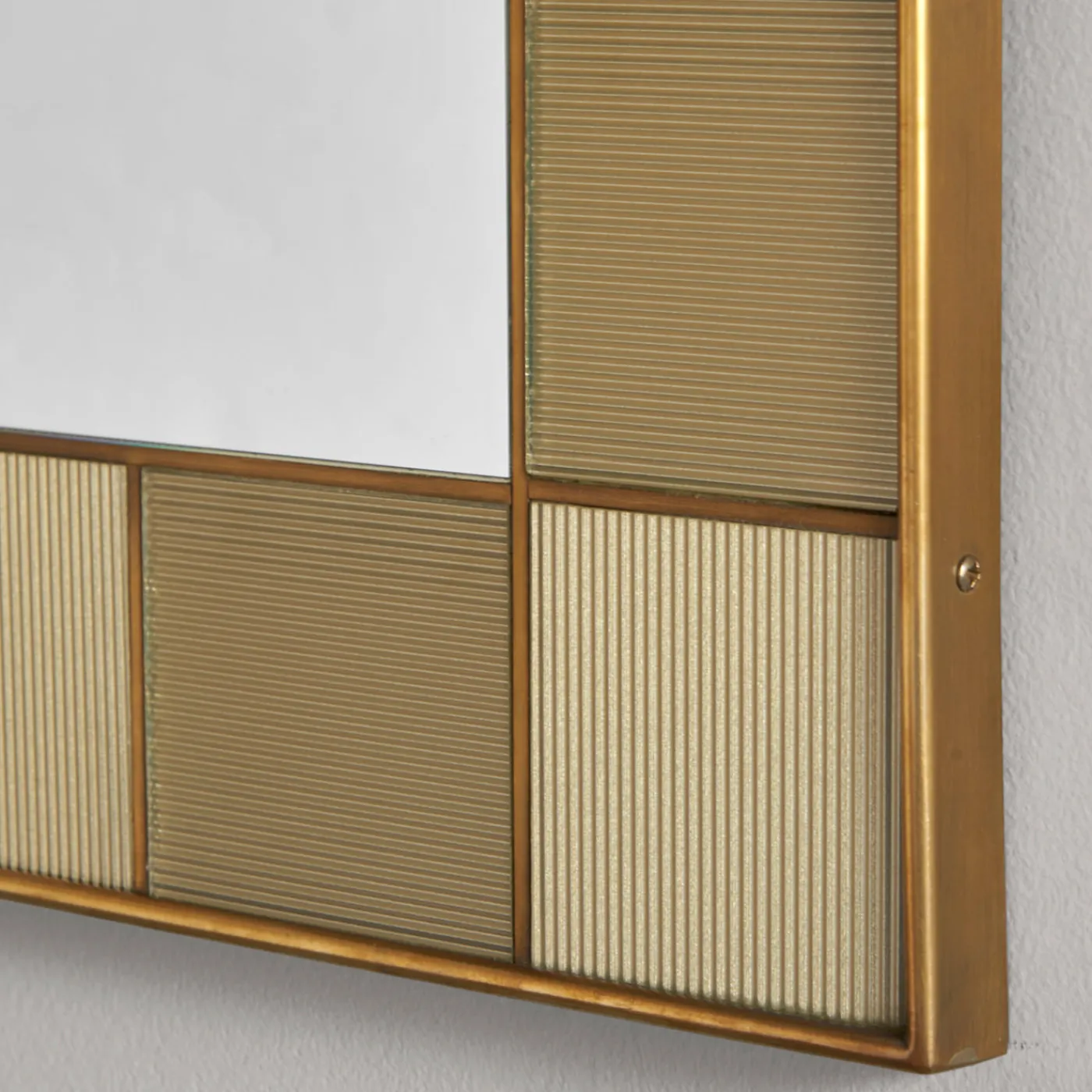 Specchio da parete rettangolare dal carattere distintivo, incorniciato da un motivo geometrico composto da piastrelle alternate in ottone satinato e vetro dorato texturizzato. Il contrasto tra superfici lisce e ondulate crea un affascinante ritmo visivo, amplificando la riflessione della luce e donando profondità al design. Con la sua eleganza essenziale e il gusto contemporaneo, questo specchio si presta a valorizzare ambienti interni diversi, aggiungendo un tocco di sobria raffinatezza.