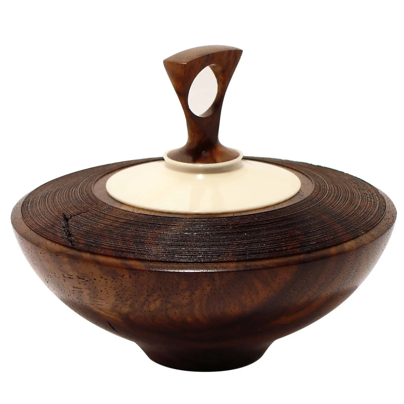 La forma classica di questa ciotola di squisita fattura è pensata per contenere oggetti preziosi o semplicemente per essere esposta come una splendida opera d’arte. Evocativa di antichi vasi, la ciotola rotonda in legno di noce presenta uno sfondo marrone chiaro con un ricco motivo a riccioli color cioccolato. Perfettamente in equilibrio sul coperchio arricchito da un inserto in Galalith color avorio, il pomello geometrico in radica di noce aggiunge un tocco sofisticato e unico a questo prezioso oggetto.